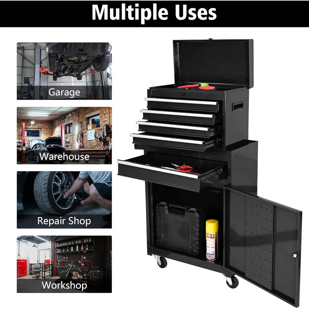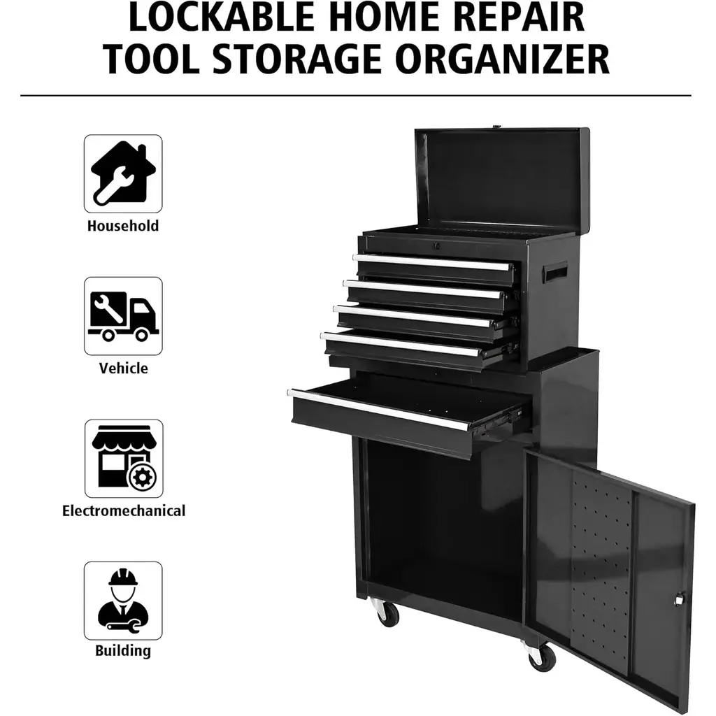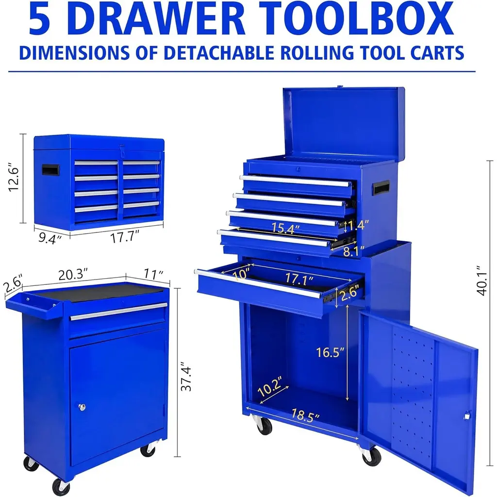 1. Versatile Design: Enhanced Flexibility and FunctionalityThis tool chest is designed with versatility in mind, offering s unmatched flexibility to adapt to their specific needs. The detachable top and bottom allow you to use the tool cabinet as a single unit or separate it into individual sections, providing ultimate adaptability for different storage requirements and occasions.Detachable top and bottom for versatile use.Ideal for organizing tools, materials, or other items in various settings.2. Premium Materials & Sturdy Structure: Built to LastCrafted from high-quality metal materials, this tool chest combines style and durability, ensuring it withstands the test of time. Its robust and stable internal structure guarantees reliability and long-term performance, making it a dependable addition to any workspace.High-quality metal construction for durability and strength.Weight capacity of 100kg ensures stability and longevity.3. Convenient Mobility: Easy to Move and OperateEquipped with four wear-resistant wheels, this 5-drawer tool chest is designed for effortless mobility. The multi-functional handles, including screwdriver holders on the side, provide added convenience and ease of operation, eliminating the need for strenuous lifting.Four durable wheels for smooth movement.Side handles with screwdriver holders for added functionality.4. Smart Storage Design: Space-Saving and OrganizedThe garage tool box features five spacious drawers with ball guide rails, each capable of holding up to 15kg. Additionally, it includes an adjustable shelf and bolts inside, offering ample storage space and flexibility to customize according to your needs.Five spacious drawers with ball guide rails for smooth operation.Adjustable shelf and bolts for customizable storage solutions.Maximum drawer weight capacity: 15kg per drawer.5. User-Centric Details: Enhanced Organization and EfficiencyThe interior door of the tool cart chest includes holes designed for hooks, allowing you to hang tools and maximize space utilization. This thoughtful design ensures your tools are always organized, accessible, and within reach.Interior hooks for hanging tools.Improved space utilization for better organization.