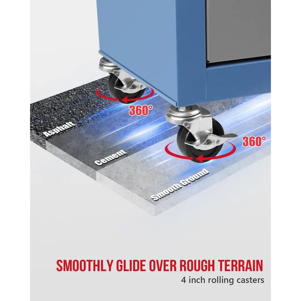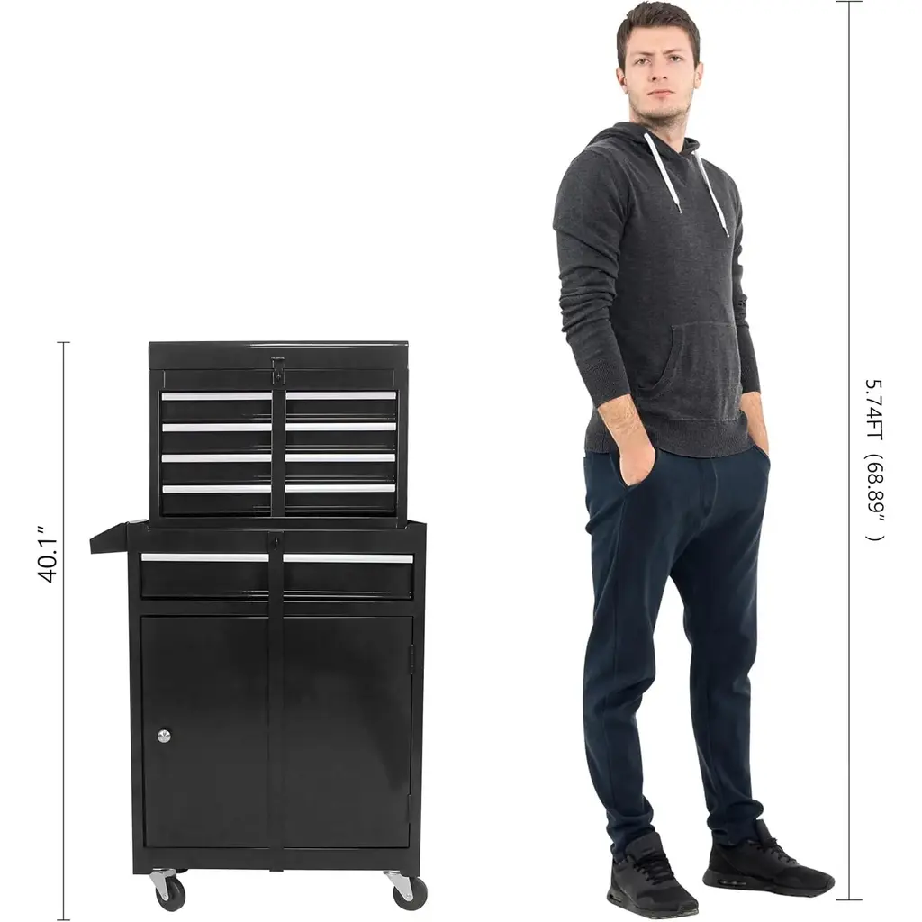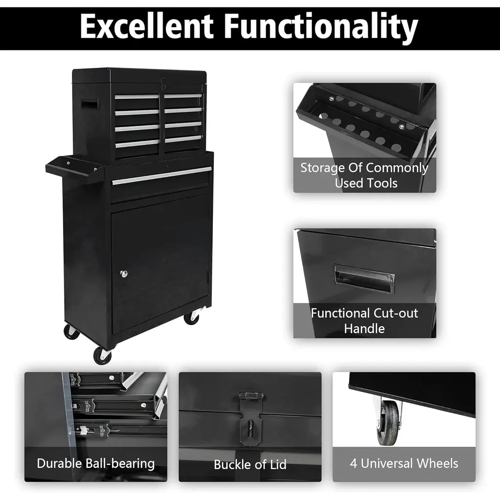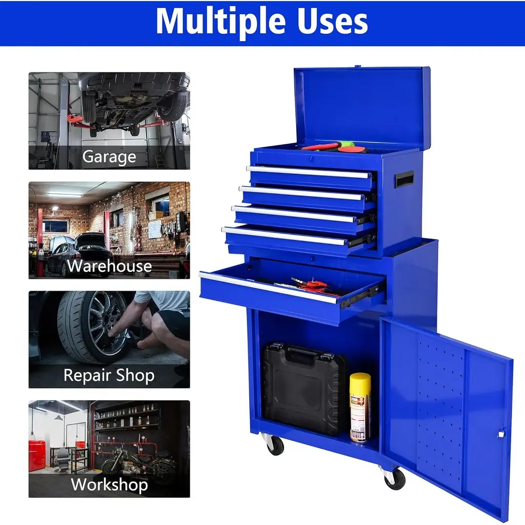 1. Versatile Design: Enhanced Flexibility and FunctionalityThis tool chest is designed with versatility in mind, offering s unmatched flexibility to adapt to their specific needs. The detachable top and bottom allow you to use the tool cabinet as a single unit or separate it into individual sections, providing ultimate adaptability for different storage requirements and occasions.Detachable top and bottom for versatile use.Ideal for organizing tools, materials, or other items in various settings.2. Premium Materials & Sturdy Structure: Built to LastCrafted from high-quality metal materials, this tool chest combines style and durability, ensuring it withstands the test of time. Its robust and stable internal structure guarantees reliability and long-term performance, making it a dependable addition to any workspace.High-quality metal construction for durability and strength.Weight capacity of 100kg ensures stability and longevity.3. Convenient Mobility: Easy to Move and OperateEquipped with four wear-resistant wheels, this 5-drawer tool chest is designed for effortless mobility. The multi-functional handles, including screwdriver holders on the side, provide added convenience and ease of operation, eliminating the need for strenuous lifting.Four durable wheels for smooth movement.Side handles with screwdriver holders for added functionality.4. Smart Storage Design: Space-Saving and OrganizedThe garage tool box features five spacious drawers with ball guide rails, each capable of holding up to 15kg. Additionally, it includes an adjustable shelf and bolts inside, offering ample storage space and flexibility to customize according to your needs.Five spacious drawers with ball guide rails for smooth operation.Adjustable shelf and bolts for customizable storage solutions.Maximum drawer weight capacity: 15kg per drawer.5. User-Centric Details: Enhanced Organization and EfficiencyThe interior door of the tool cart chest includes holes designed for hooks, allowing you to hang tools and maximize space utilization. This thoughtful design ensures your tools are always organized, accessible, and within reach.Interior hooks for hanging tools.Improved space utilization for better organization.
