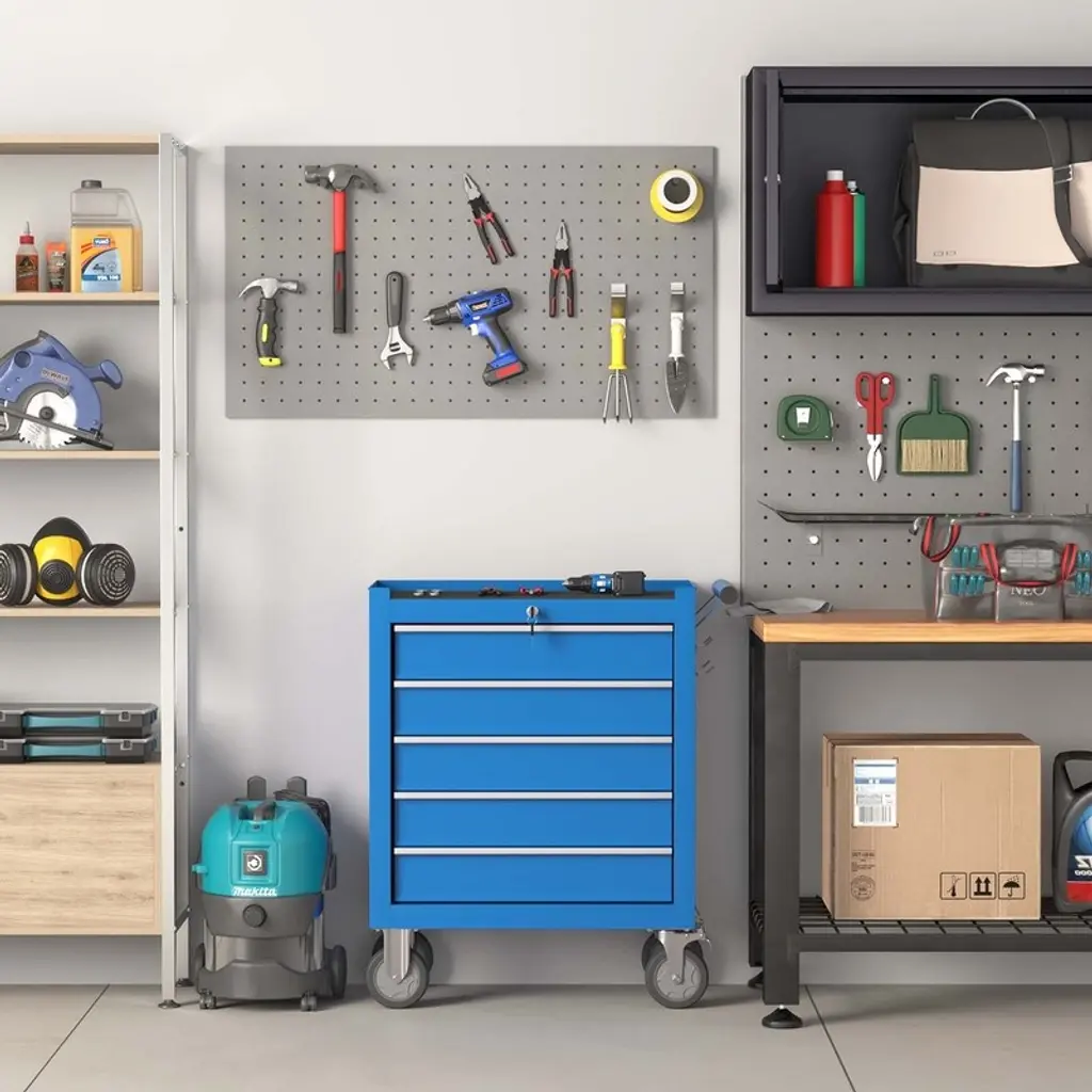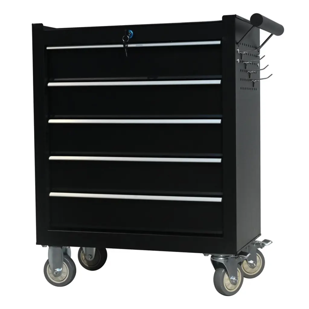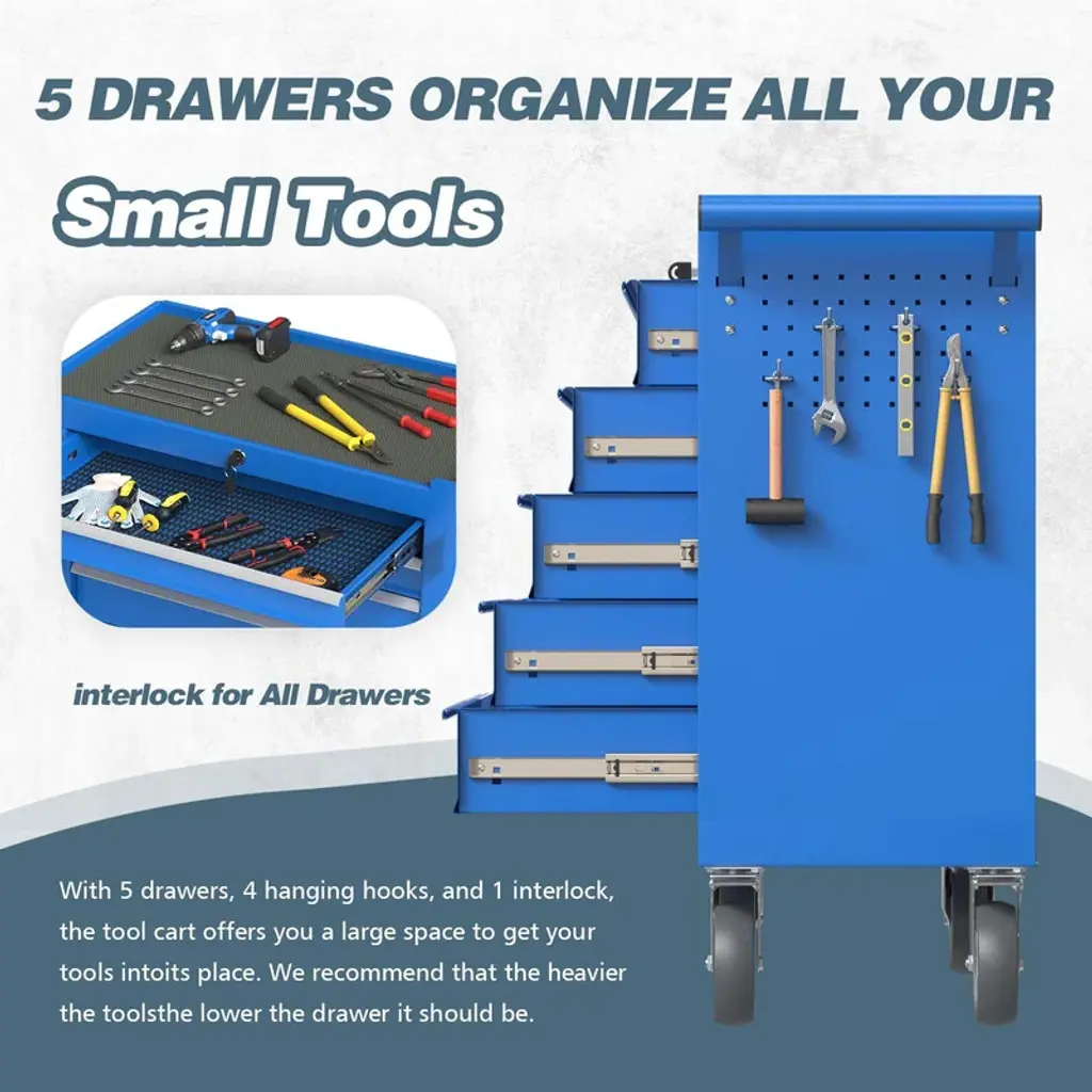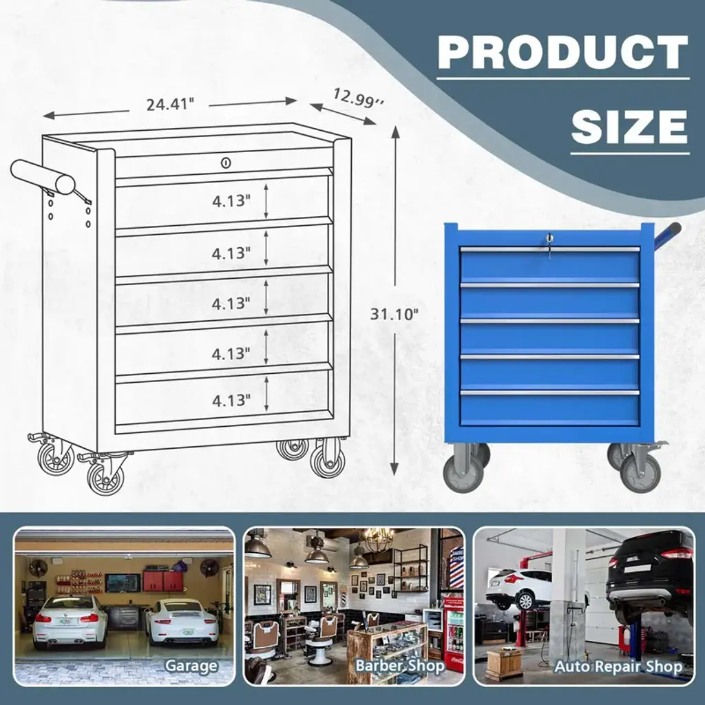 When you want to use a tool and can't find it? Are your tools scattered all over the place? Did you give up because you spent a long time looking for a tool and didn't find it? If you have any of the above questions, our toolbox is the perfect solution to your problem. Upgrade your workshop with our versatile Tool Chest, designed to meet all your tool storage needs. Product Description:Product Dimensions: 12.99"D x 24.41"W x 31.1"H inchesMaterial: Alloy SteelItem Weight: About 46.08 poundsFeatures:【Ample Storage】: Comprising five drawers, this tool chest provides dedicated space for tools of all sizes. Keep your workspace organized and clutter-free.【Drawer Liners Inlcuded】: The drawers come equipped with non-slip liners, ensuring your tools stay securely in place. Protect your valuable tools from scratches and damage.【Ball-Bearing Slides】: Thanks to the ball-bearing slides, each drawer effortlessly glides open and closed. Experience smooth and quiet operation every time.【High Mobility】 : Move your tools with ease using the four silent wheels, including two swivel casters with brakes and two fixed casters. The widened side handle adds convenience to transportation.【Durable Construction】: Crafted from ultra-hard cold-rolled steel, the tool chest is built to withstand heavy use. The surface features a rust-resistant and corrosion-resistant coating, making it easy to clean and maintain.【Multiple Purpose】: Suitable for various work environments, this tool chest makes for an ideal Christmas or New Year's gift for fathers, boyfriends or husbands who love working with their hands.【Easy Assembly】: Comes pre-assembled, just need to install the wheels.