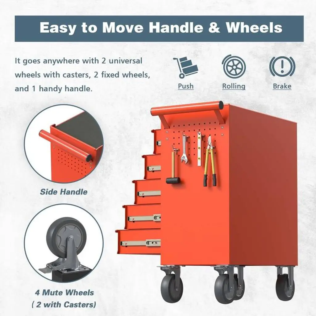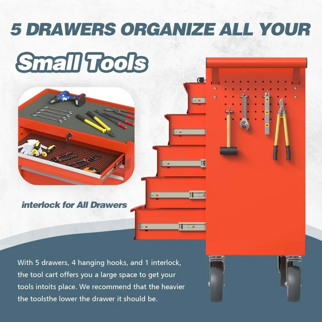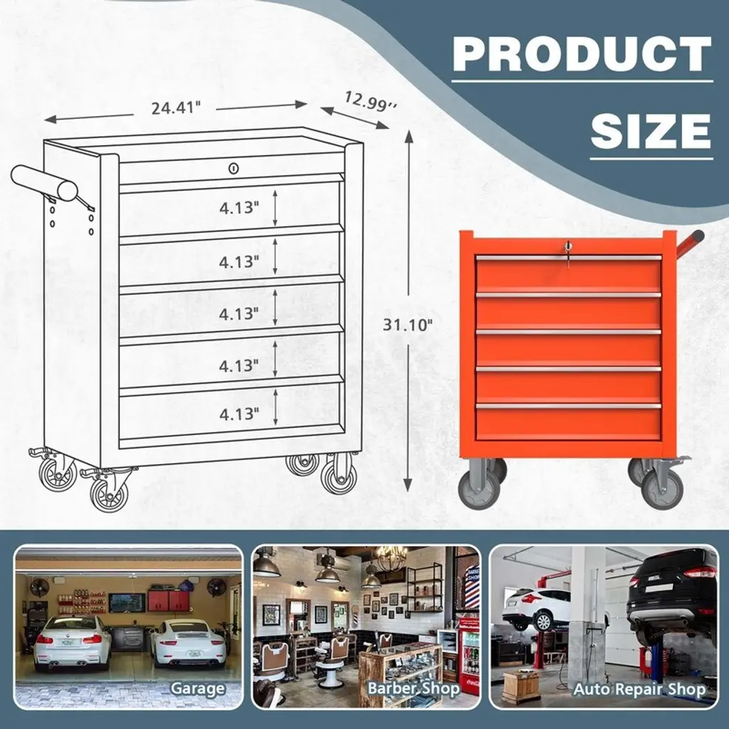 When you want to use a tool and can't find it? Are your tools scattered all over the place? Did you give up because you spent a long time looking for a tool and didn't find it? If you have any of the above questions, our toolbox is the perfect solution to your problem. Upgrade your workshop with our versatile Tool Chest, designed to meet all your tool storage needs. Product Description:Product Dimensions: 12.99"D x 24.41"W x 31.1"H inchesMaterial: Alloy SteelItem Weight: About 46.08 poundsFeatures:【Ample Storage】: Comprising five drawers, this tool chest provides dedicated space for tools of all sizes. Keep your workspace organized and clutter-free.【Drawer Liners Inlcuded】: The drawers come equipped with non-slip liners, ensuring your tools stay securely in place. Protect your valuable tools from scratches and damage.【Ball-Bearing Slides】: Thanks to the ball-bearing slides, each drawer effortlessly glides open and closed. Experience smooth and quiet operation every time.【High Mobility】 : Move your tools with ease using the four silent wheels, including two swivel casters with brakes and two fixed casters. The widened side handle adds convenience to transportation.【Durable Construction】: Crafted from ultra-hard cold-rolled steel, the tool chest is built to withstand heavy use. The surface features a rust-resistant and corrosion-resistant coating, making it easy to clean and maintain.【Multiple Purpose】: Suitable for various work environments, this tool chest makes for an ideal Christmas or New Year's gift for fathers, boyfriends or husbands who love working with their hands.【Easy Assembly】: Comes pre-assembled, just need to install the wheels.
