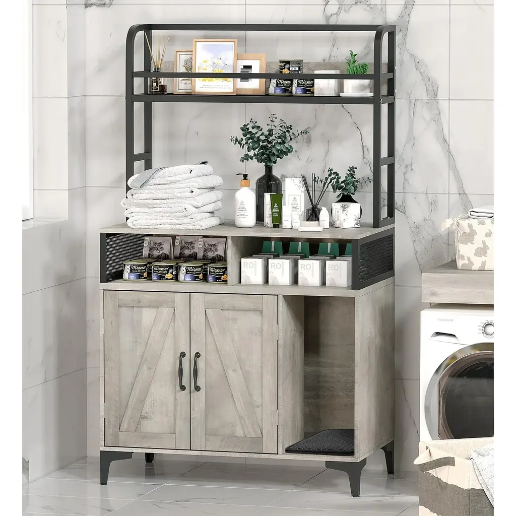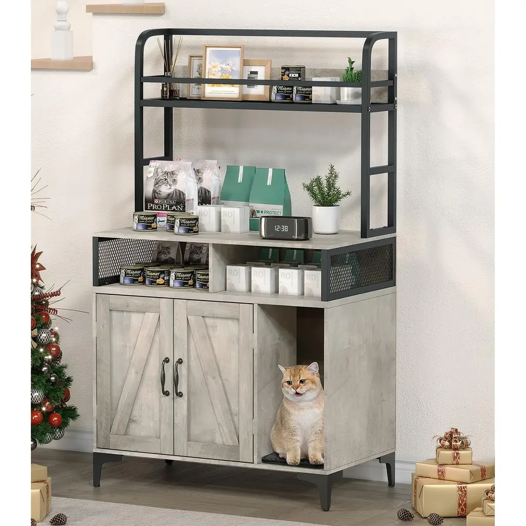 Hidden Litter Box: The enclosed design of this litter box creates a private and stress-reducing environment for your cat. The side door allows for easy access to the litter box while effectively keeping dogs out and preventing messes, and the double-door configuration simplifies the process of changing the litter. Ample Storage Space: This cat litter box cabinet offers multiple shelves specifically designed for storing cat supplies and other household items. This feature helps maintain a tidy space, enhances organization, and makes it easy to quickly locate essentials, keeping your living area clutter-free. Stylish & Functional: With its modern and minimalist design, this cat furniture piece blends seamlessly into any home décor. It not only serves as a hidden house for your cat but also can function as a chic display stand, storage bookshelf, or stylish organizer for your bedroom or living room. Easy Cleaning: Designed for convenience, this cat litter box enclosure includes ventilation holes that promote optimal airflow, helping to prevent odor buildup. Additionally, it features a removable litter mat, making cleanup easy and ensuring a fresh and clean environment for both you and your cat. Easy Assembly: The hidden litter box comes with detailed instructions and all necessary tools for a quick and straightforward setup. By ensuring that all parts are correctly assembled and screws are tightened, you can secure stability and provide a safe and reliable litter box enclosure for your furry friend.
