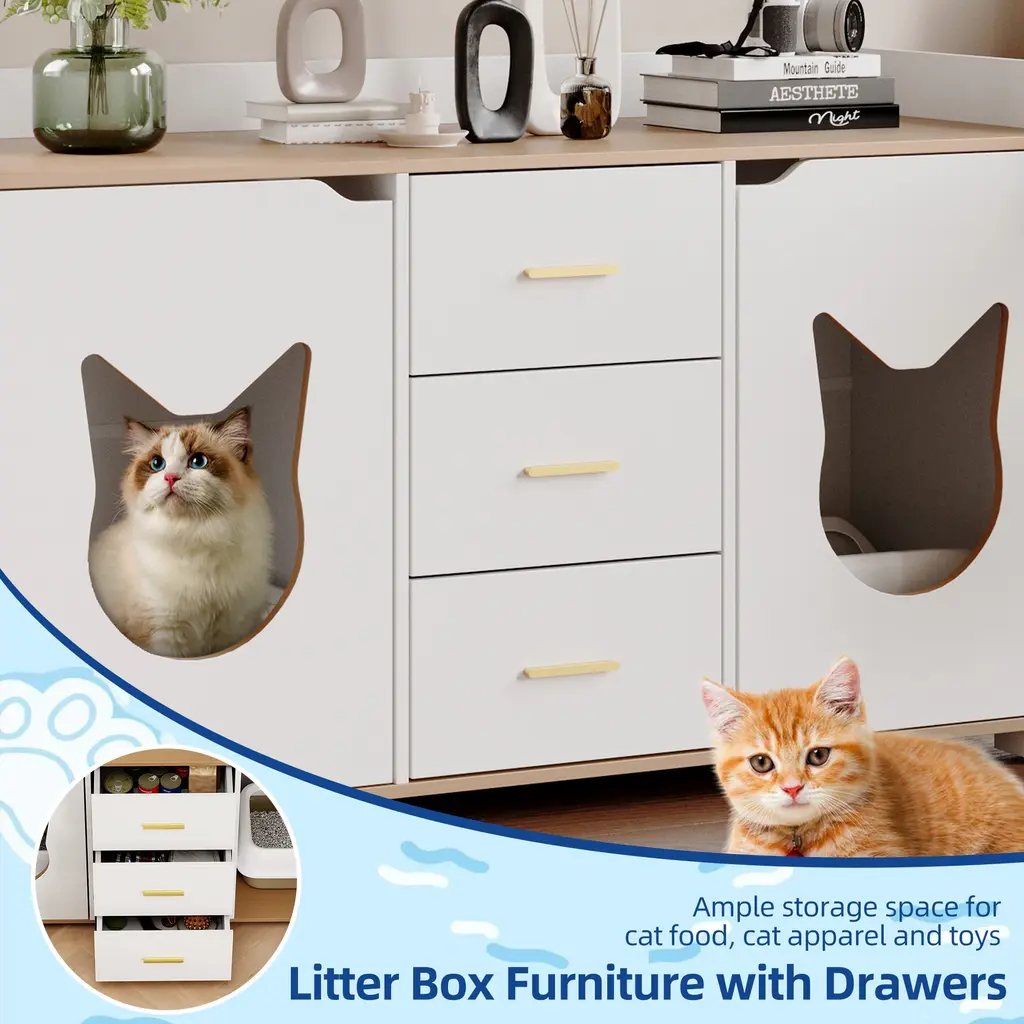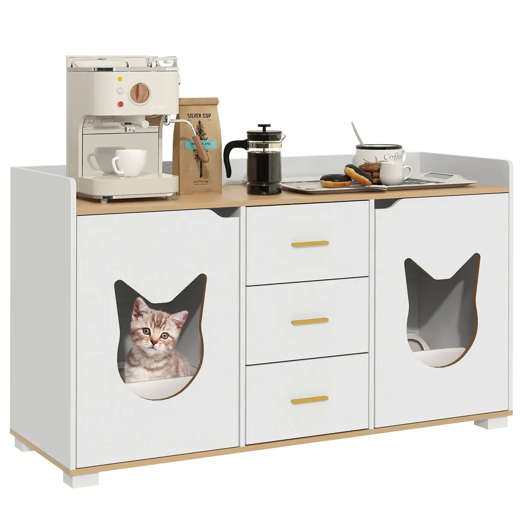 55"l Cat Litter Box Enclosure Storage Cabinet With Double Room - White