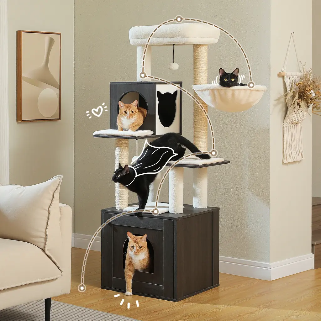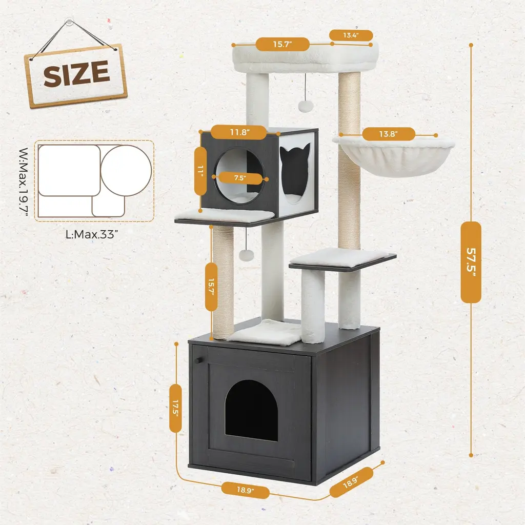 Transform your living space into a cat paradise with our Large Indoor Wooden Cat Tree with Litter Box Enclosure. This multi-level cat tower is thoughtfully crafted from high-density wood, ensuring durability and stability for years of use. The spacious design includes a cozy private apartment, a large top perch, and a convenient litter box enclosure, making it perfect for indoor cats who love to explore and relax. Spacious Design for Indoor Cats:Durable High-Density Wood Construction:Functional Storage Cabinet:Sisal-Wrapped Scratching Posts:Repairable Hanging Balls & Spoons Hammock: