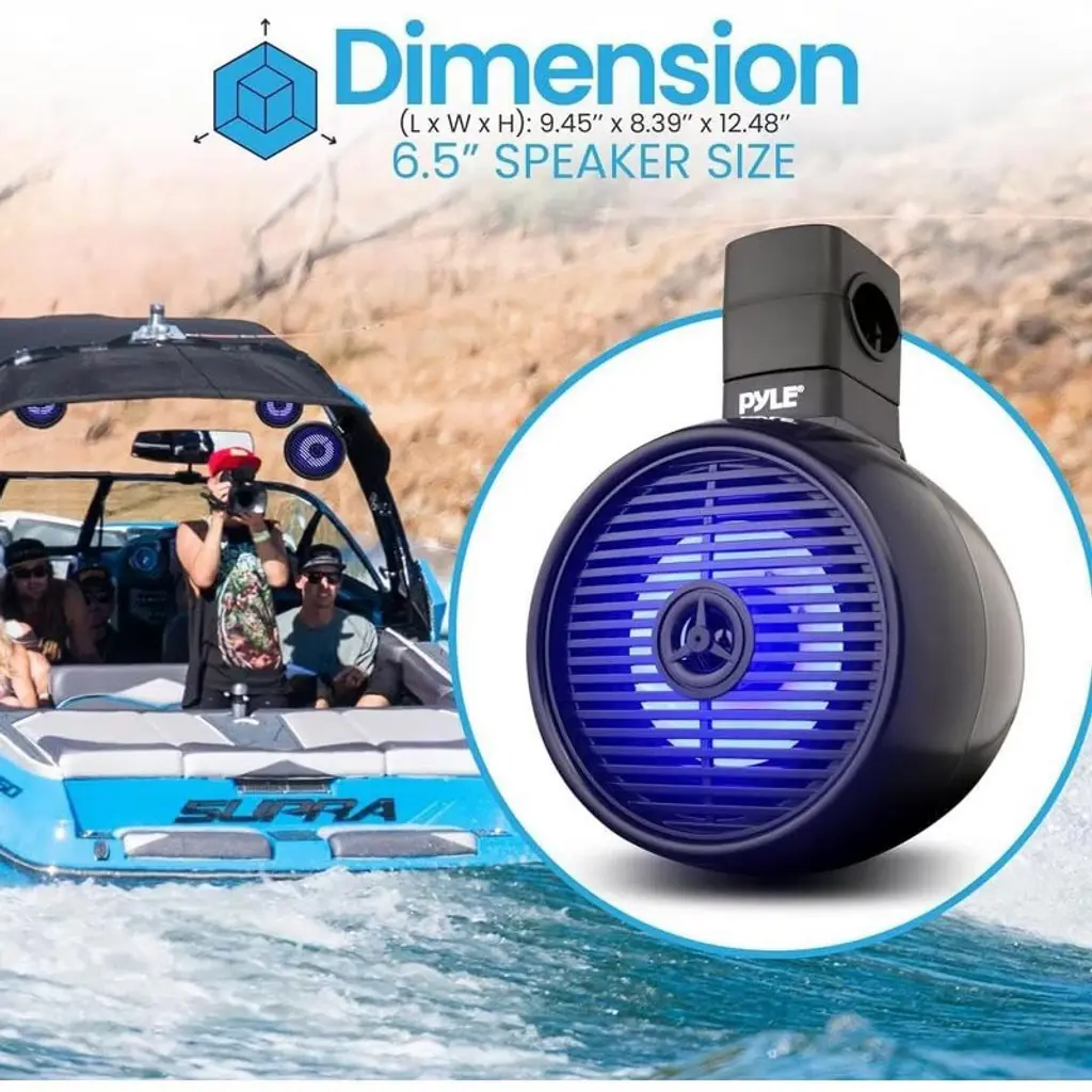 Upgrade your marine audio experience with the Pyle PLMRWKBT65BK 6.5" Marine Wakeboard Bluetooth Speaker System. This dual 2-way mini box speaker system delivers powerful, clear full-range sound, perfect for watercraft and outdoor use. Featuring Bluetooth wireless music streaming, you can easily connect your smartphone, tablet, or other Bluetooth-enabled devices. The speakers come with built-in LED lights for a stylish and functional design. Constructed with heavy-duty ABS and marine-grade materials, they ensure durability and water resistance. The included mounting brackets and hardware make installation straightforward, allowing you to enjoy high-quality audio on the go.