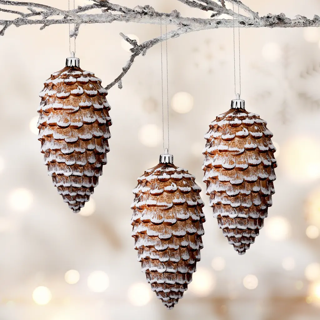 Give your tree a woodland feel with a 6.5" Snowed Pinecone Ornament Box of 3. Made from premium shatterproof plastic, these ornaments ensure safety without compromising style. Reminiscent of a snow-covered pine cone with a glitter finish, this ornament radiates festive winter charm. A gold string is attached for easy hanging. Adorn your Christmas tree, wreaths, garlands, or even used as a decorative accent around your home. You may experience glitter dust off in packaging and during initial setup, this is normal and will not affect the overall product design. Embrace the magic of winter!