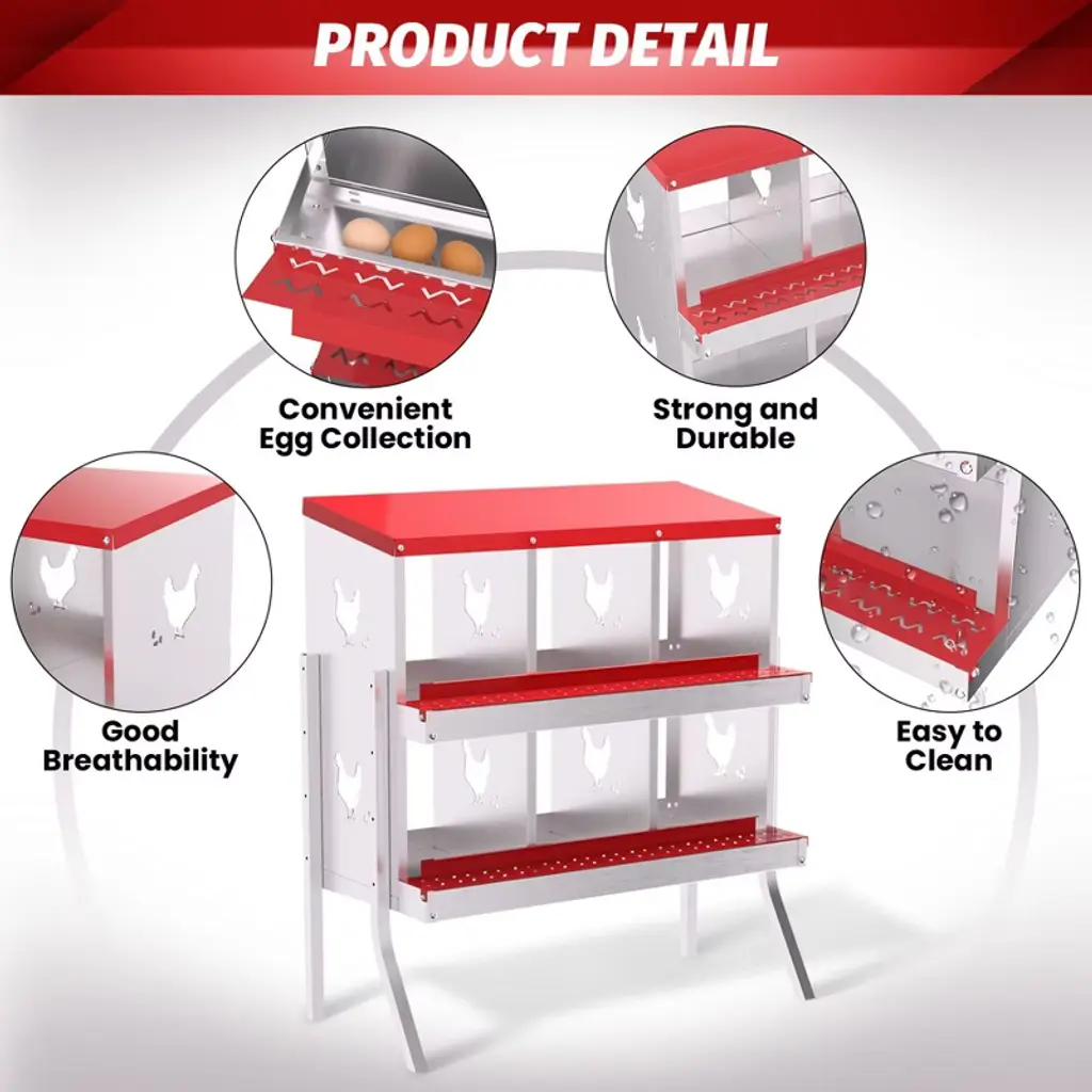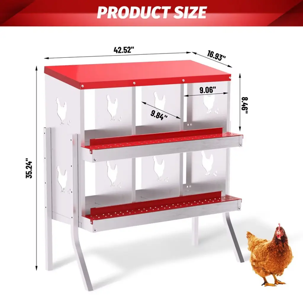 Give your flock the best with this Heavy-Duty Galvanized Steel Chicken Nesting Box, designed for long-lasting durability, increased egg production, and maximum egg protection. Highlights at a Glance:- Made from premium galvanized steel for long-lasting durability- 6/8/10-hole nesting box design maximizes egg-laying space- Removable sliding tray for quick, easy, and hygienic cleaning- Ventilated compartments improve airflow and hens comfort- Spacious compartments prevent egg crowding and breakage- Wall-mount or stackable for flexible coop installation- Suitable for both hens and ducks in backyard or commercial coops- Easy access for hens and convenient egg collection for you- Secure lid and sturdy construction for maximum egg protection Specification:Material: Galvanized SteelProduct Size:6 Compartment: 32.09”L x 17”W x 26.57”H8 Compartment: 42.72”L x 16.93”W x 26.57”H10 Compartment: 53.54”L x 16.93”W x 26.57”H Packing List:1x Chicken Nesting Box1x Hardware Pack1x Instruction Manual Friendly Note:1. Place the chicken nesting box in a quiet, dry, and sheltered area of your chicken coop for best egg-laying results.2. Check and clean the nesting box regularly—remove eggs daily and use the removable tray for quick, easy cleaning to maintain a healthy environment.3. Add soft bedding or nesting pads inside each compartment to cushion eggs and encourage hens to lay.4. Ensure the nesting box is securely mounted or placed on a stable surface at the recommended height for your flock.
