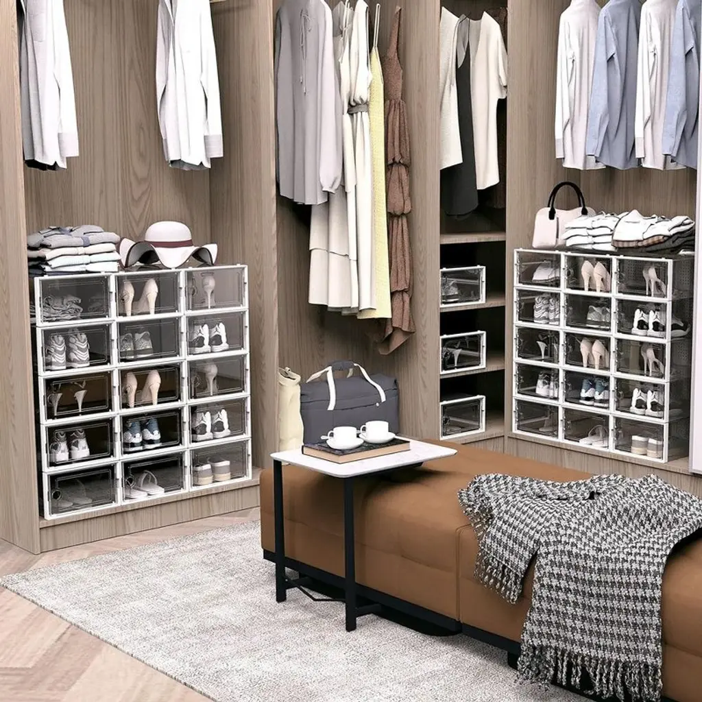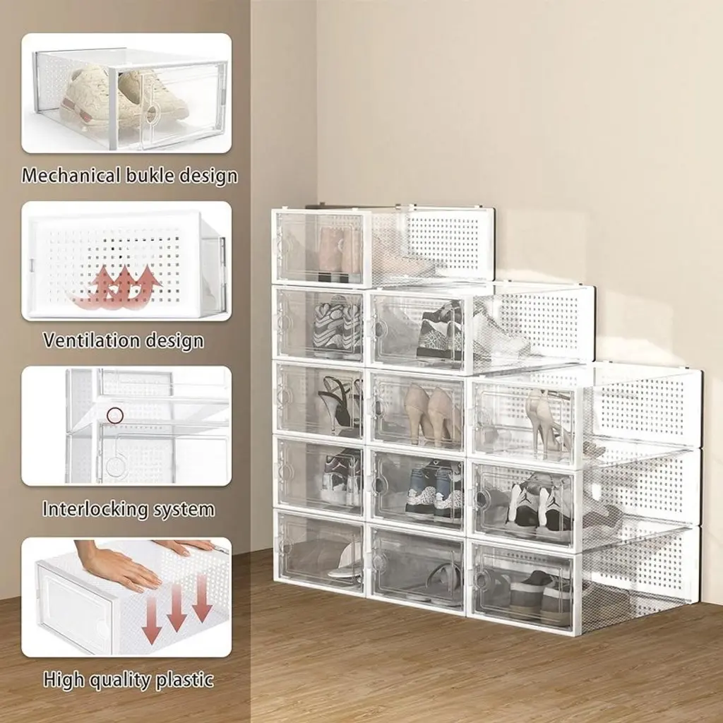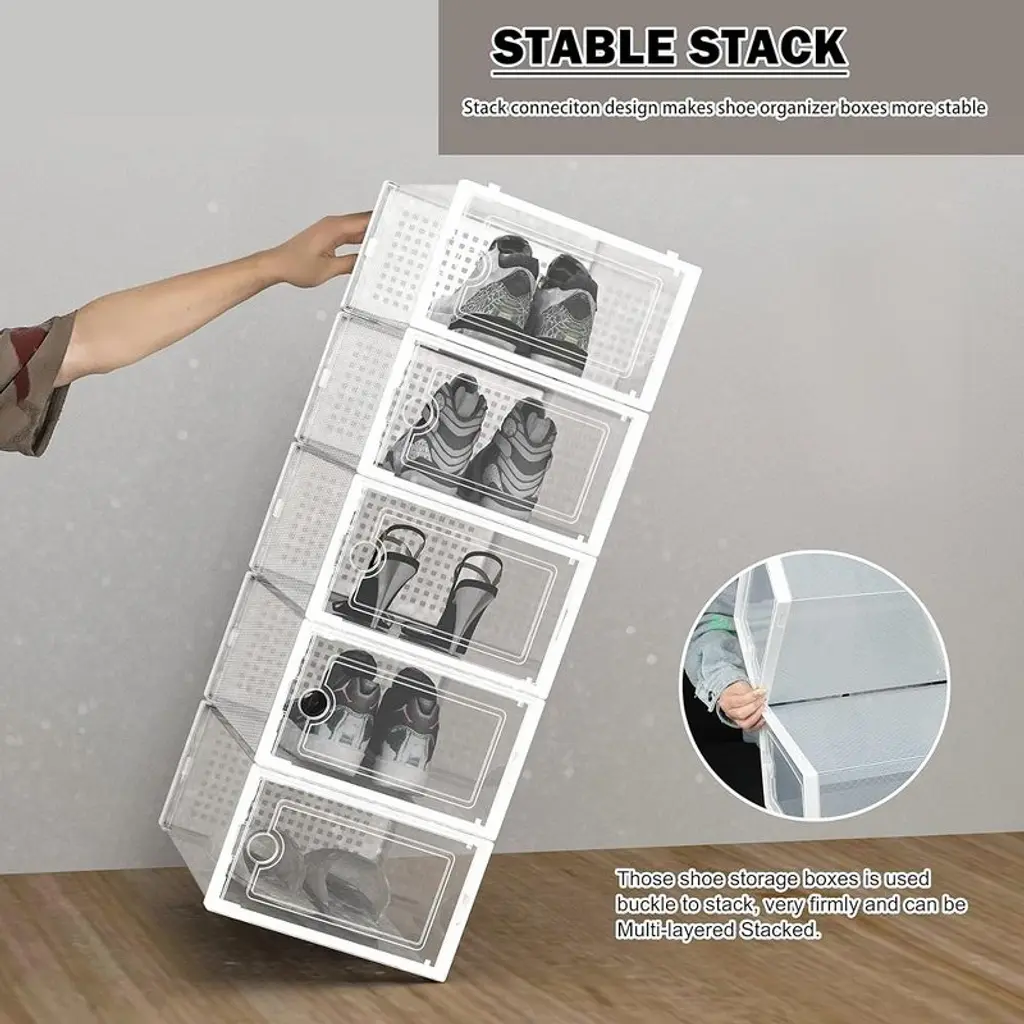 Stackable shoe storage boxes amazing for dust free and maximizing storage space. Create a shoe tower with snap-tight clasp design, upgrade your shoe organization to next level. Find right shoes through clear front door with a glimpse. Ideal for organizing small daily items such as shoes, scarves, winter gear, clothing, purses, crafts, toys, books, games and more Ideal for closet, bedroom, bathroom, laundry room, craft room, mudroom, offices, playroom, garage, or any room of your home / apartment / condo / dorm room / RV or camper. Each bin size 13.1''L×9''W×5.5''H Inch, fits various types of shoes up to US size 9; Heels, flats, sneakers, flip flops, sandals, wedges, all shoes are welcomed in these shoe containers.