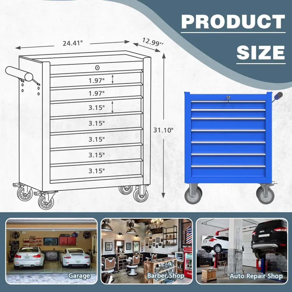 When you want to use a tool and can't find it? Are your tools scattered all over the place? Did you give up because you spent a long time looking for a tool and didn't find it? If you have any of the above questions, our toolbox is the perfect solution to your problem. Upgrade your workshop with our versatile Tool Chest, designed to meet all your tool storage needs. Product Description:Product Dimensions: 12.99"D x 24.41"W x 31.1"H inchesMaterial: Alloy SteelItem Weight: About 52.9 poundsFeatures:【Ample Storage】: Comprising seven drawers, this tool chest provides dedicated space for tools of all sizes. Keep your workspace organized and clutter-free.【Drawer Liners Inlcuded】: The drawers come equipped with non-slip liners, ensuring your tools stay securely in place. Protect your valuable tools from scratches and damage.【Ball-Bearing Slides】: Thanks to the ball-bearing slides, each drawer effortlessly glides open and closed. Experience smooth and quiet operation every time.【High Mobility】 : Move your tools with ease using the four silent wheels, including two swivel casters with brakes and two fixed casters. The widened side handle adds convenience to transportation.【Durable Construction】: Crafted from ultra-hard cold-rolled steel, the tool chest is built to withstand heavy use. The surface features a rust-resistant and corrosion-resistant coating, making it easy to clean and maintain.【Multiple Purpose】: Suitable for various work environments, this tool chest makes for an ideal Christmas or New Year's gift for fathers, boyfriends or husbands who love working with their hands.【Easy Assembly】: Comes pre-assembled, just need to install the wheels.