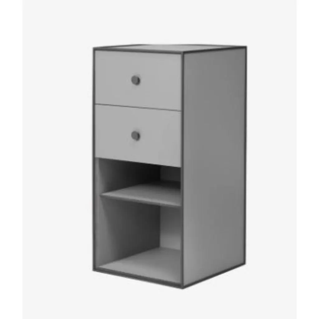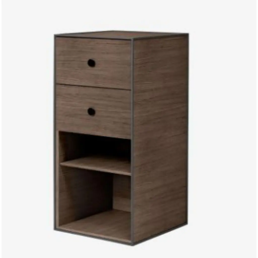 70 smoked oak frame box with shelf / 2 drawers by LassenDimensions: D 35 x W 35 x H 70 cm Materials: Finér, Melamin, Melamin, Melamine, Metal, Veneer, OakAlso available in different colors and dimensions.Weight: 13 KgBy Lassen is a Danish design brand focused on iconic designs created by Mogens and Flemming Lassen, founded by Lassens’ relatives in 2008. Brothers Mogens (1901-1987) and Flemming (1902-1984) Lassen are known as two of Denmark’s greatest architects and designers. Both were renowned pioneers of Danish functionalism and modernist architecture, honoured with numerous prestigious medals and awards. Headed by Mogens Lassen’s grandson Søren Lassen, By Lassen carries on the brothers’ design philosophy by manufacturing their iconic designs as well as products by other designers that complement the Lassen’s functionalist style. The company’s mission is to continue the tradition of timelessness, functionality and quality, and to introduce the Lassen’s design heritage to new generations.