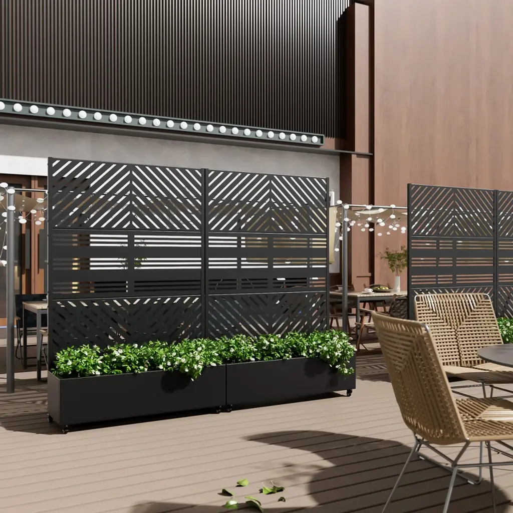 This functional product that combines the functions of a modern privacy screen and a garden planting box climbing frame is made of high-quality galvanized steel and laser cutting technology. Available in black, white, brown and gray with a variety of simple and delicate floral patterns, it can not only be used to grow flowers and plants on the balcony, but also be assembled to divide the indoor and outdoor areas, creating a private space as well as decorating the space. Meanwhile, the metal material is sturdy and durable, suitable for all kinds of weather conditions, windproof, rainproof and corrosion-resistant. Easy to install, can be assembled freely, with pulleys at the bottom for easy movement.