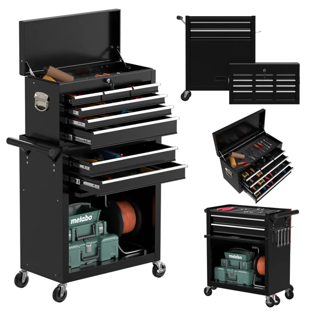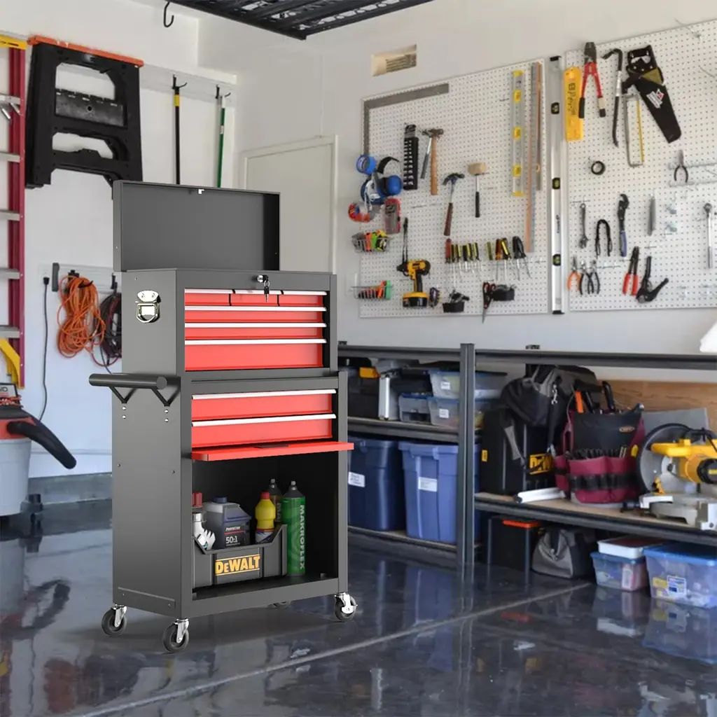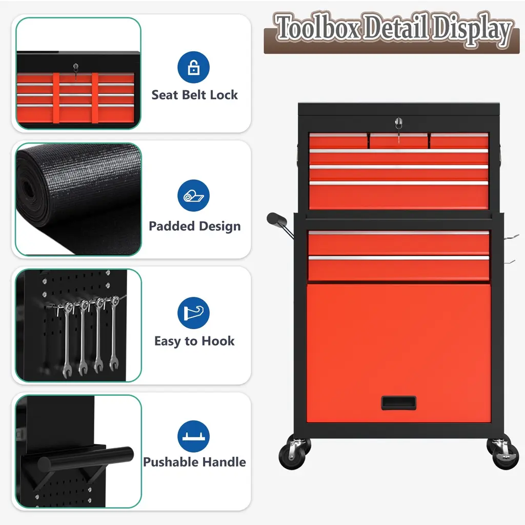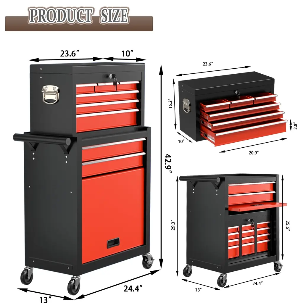 Specification:Material: SteelColor: Red/Black/Orange/BlueFull size: 24.4" (L) x 13" (W) x 42.9" (H)Top Toolbox: 23.6" (L) x 10" (W) x13.6"(H)Bottom Tool chest: 24.4" (L) x 13" (W)x29.3" (H)Product weight: About 62 poundsProduct Description:1. The toolbox includes 1 top box, 3 small drawers, 3 large drawers, 2 tray drawers and 1 large cabinet. You can use them as needed.2. The structure is sturdy and durable, with strong load-bearing capacity, and long service life.3. 4 pulleys, easy to move and do whatever you want. 2 universal wheels with brakes, which can be fixed when you work.4. The top and bottom cabinets are equipped with locks, you can put valuable tools in them, so you can put them in peace of mind.5. Provide you with the best service. If you have any questions, please feel free to contact us, we will get back to you within 24 hours.How to assemble this toolbox:The top section were located in the cabinet on the bottom, remove some screws and the side panel and then it will slide out. You only need a screwdriver and assemble according to the instructions, no other tools are required.Top chest and bottom cabinet are detachable to meet your needs for separate use.