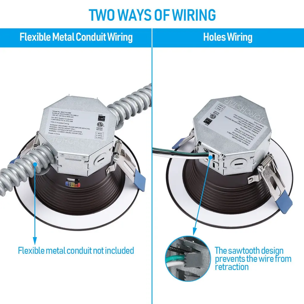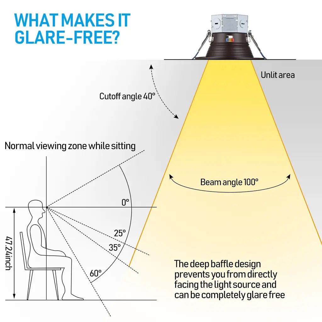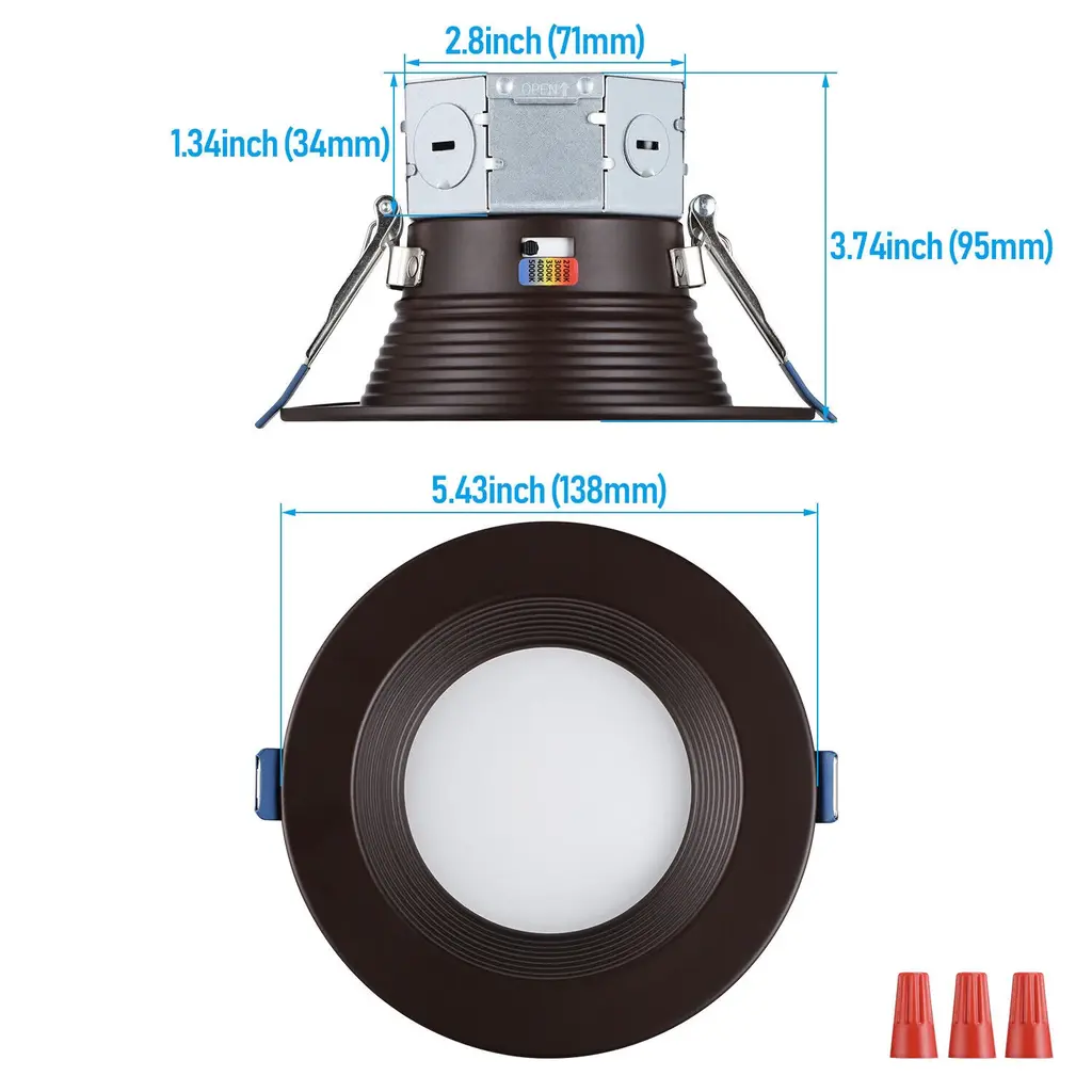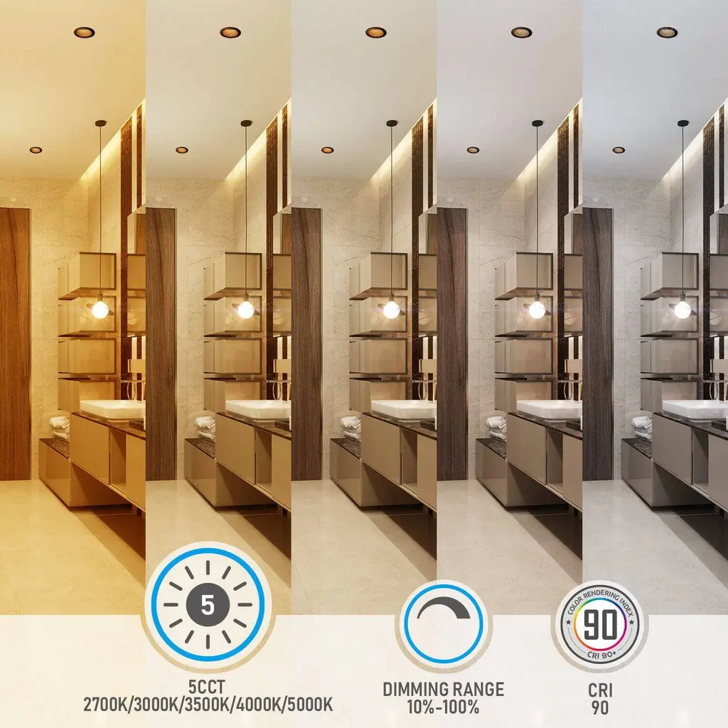 5CCT Color ChangingFeaturing both 5 color temperature adjustability (ranging from 2700K to 5000K) and a 10% to 100% dimming range, this LED light can be adjusted from warm to cool lighting. It is also compatible with most dimmers, enabling you to achieve seamless dimming from 100% brightness down to 10%.User-friendlyThis LED light boasts a super anti-glare feature, thanks to its deep baffle design that effectively eliminates any annoying glare and dazzle. It provides a superior lighting experience. This light has a simple and traditional appearance, making it a versatile choice for a range of settings. It is also designed to be used in wet locations, making it the perfect option for bathroom lighting.WarrantyThis light is certified by ETL, JA8, and T24 (only for 4000K and below with JA8 and T24 certification). It has a service life of up to 50,000 hours and comes with a 3-year warranty.Compatible DimmersCompatible with LUTRON: CT-600PR,MSCL-OP153MH,DVWCL-153PH,TGCL-153PR, MA-RR,DVCL-153PR,SCL-153PR,P-PKG1W-WH-R, MACL-153MH LEVITON: ROO-RNL06-TWSpecifications:Wattage: 10WVoltage: 120V Equivalent: 100WLuminous flux: 800lmLifespan: 50,000hrsCCT: 2700K/3000K/3500K/4000K/5000KWaterproof rating: Wet