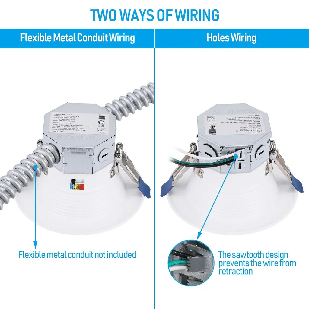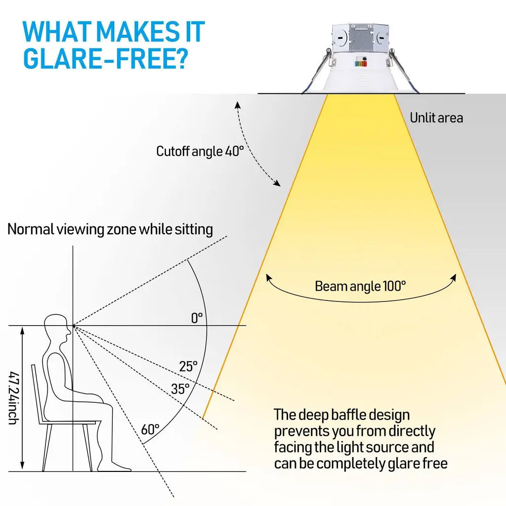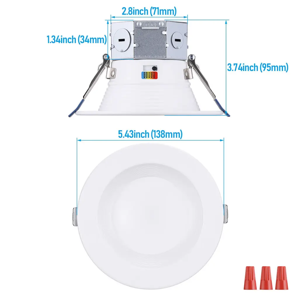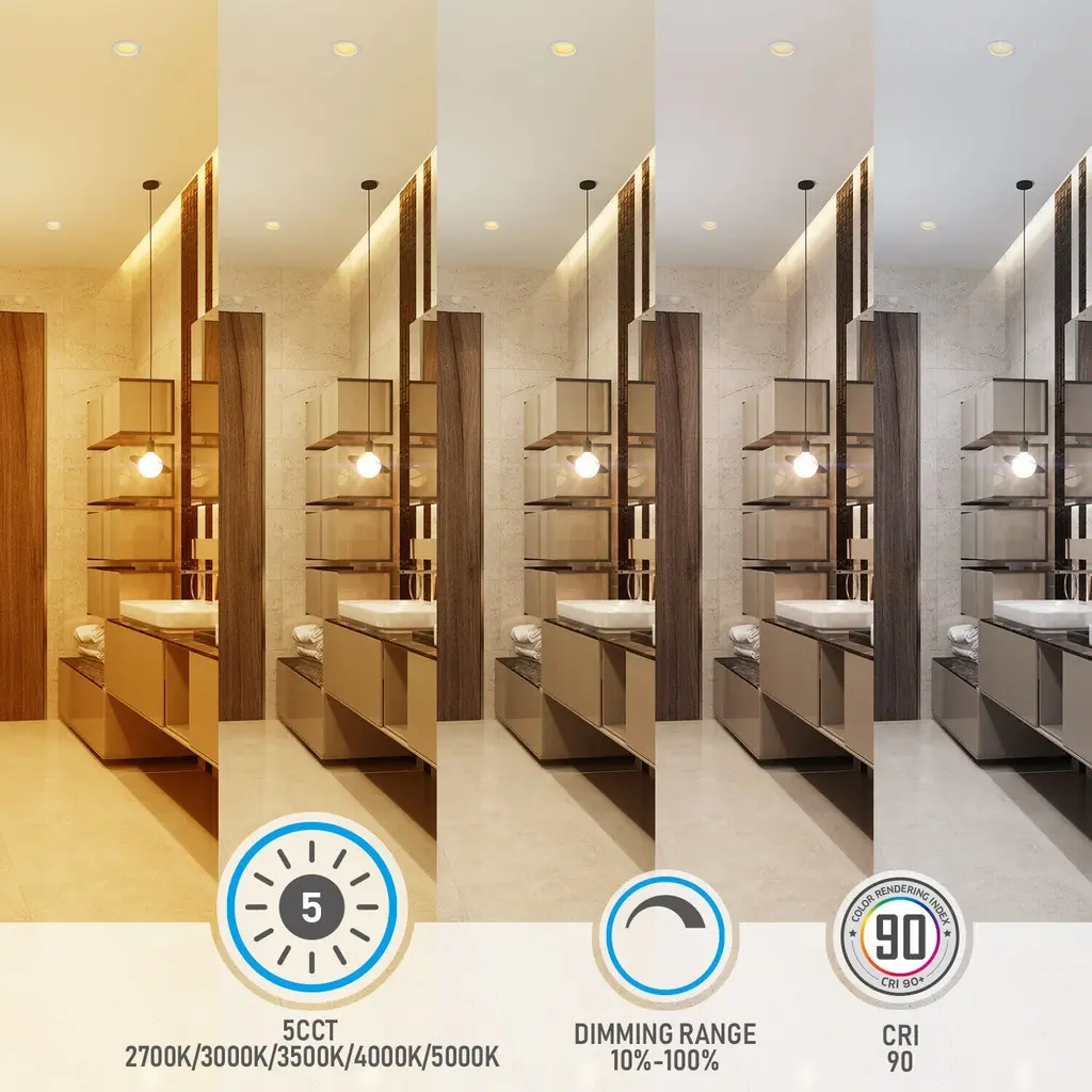 5CCT Color ChangingFeaturing both 5 color temperature adjustability (ranging from 2700K to 5000K) and a 10% to 100% dimming range, this LED light can be adjusted from warm to cool lighting. It is also compatible with most dimmers, enabling you to achieve seamless dimming from 100% brightness down to 10%.User-friendlyThis LED light boasts a super anti-glare feature, thanks to its deep baffle design that effectively eliminates any annoying glare and dazzle. It provides a superior lighting experience. This light has a simple and traditional appearance, making it a versatile choice for a range of settings. It is also designed to be used in wet locations, making it the perfect option for bathroom lighting.WarrantyThis light is certified by ETL, JA8, and T24 (only for 4000K and below with JA8 and T24 certification). It has a service life of up to 50,000 hours and comes with a 3-year warranty.Compatible DimmersCompatible with LUTRON: CT-600PR,MSCL-OP153MH,DVWCL-153PH,TGCL-153PR, MA-RR,DVCL-153PR,SCL-153PR,P-PKG1W-WH-R, MACL-153MH LEVITON: ROO-RNL06-TWSpecifications:Wattage: 10WVoltage: 120V Equivalent: 100WLuminous flux: 800lmLifespan: 50,000hrsCCT: 2700K/3000K/3500K/4000K/5000KWaterproof rating: Wet