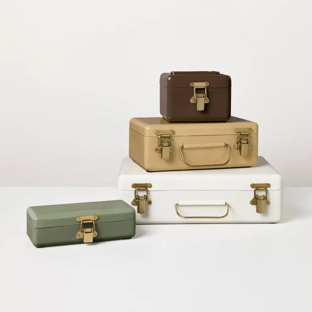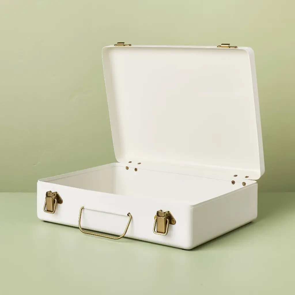 Add stylish storage to your home with this Large Metal Box with Brass Hardware from Hearth & Hand™ with Magnolia. Made of metal, this rectangular box is ideal for storing a variety of everyday use items. This lidded box is designed in a sour cream hue and is accentuated with a center handle and two brass-finished latch closures for a simple yet elegant look. Hearth & Hand™ with Magnolia: Gather • Create • Enjoy