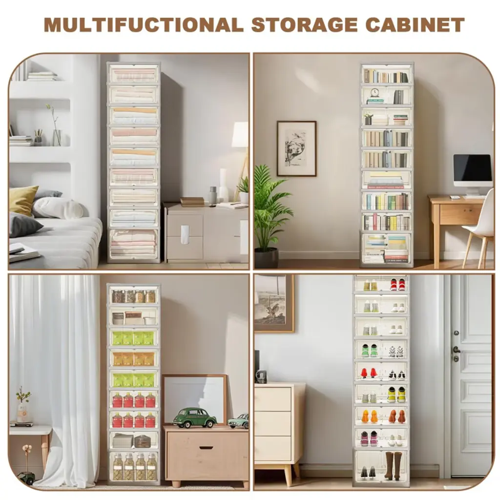 9-Tier Foldable Shoe Rack Organizer ¨C Stackable Plastic Storage Boxes with Doors for Closet & EntrywayProduct Specifications Brand: TROPOW Material: Premium PP+PS Plastic (Durable & Lightweight) Total: 28"L x 37"W x 46"H (When Stacked) Weight: 10.69 lbs (Lightweight & Portable) Assembly: Tool-Free (Foldable & Ready to Use) Doors: Magnetic Transparent Doors (Easy Access) Capacity: Stores 6-12 Pairs of Shoes (Depending on Size) Key Features**?? Smart Stackable Shoe Storage 6-Tier Foldable Design ¨C Saves space when not in use, expands for maximum storage Transparent Magnetic Doors ¨C Quickly see and access shoes without opening each box Adjustable Layout ¨C Stack vertically or arrange side-by-side to fit any space **?? Space-Saving & Portable Tool-Free Setup ¨C Unfold and use instantly (no assembly required) Lightweight & Mobile ¨C Easy to move between closet, hallway, or living room Slim Profile ¨C Fits tight spaces like under beds or in small closets **?? Multi-Use Organizer Not Just for Shoes! ¨C Stores boots, sneakers, heels, or even toys, accessories, and small items Easy to Clean ¨C Wipe down with a damp cloth (no stains or odors) **?? Why Choose This Shoe Rack?? Foldable & Compact ¨C Great for small apartments or dorm rooms? Clear Visibility ¨C No more digging through boxes to find the right pair? Sturdy Yet Lightweight ¨C Holds shoes securely without taking up much space