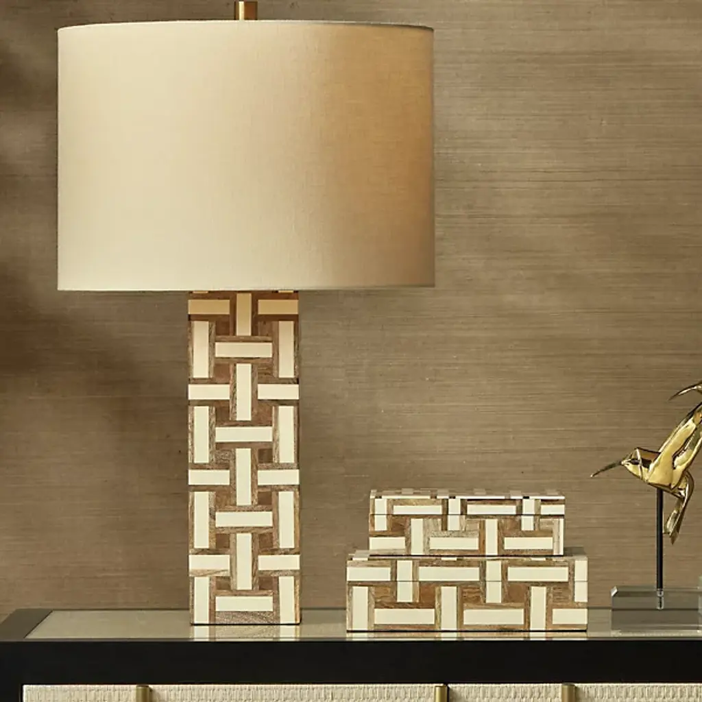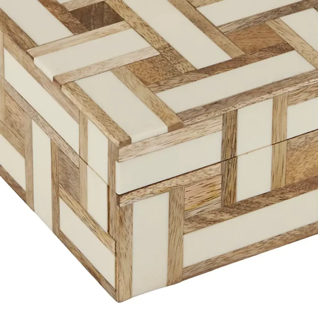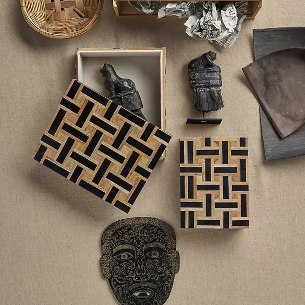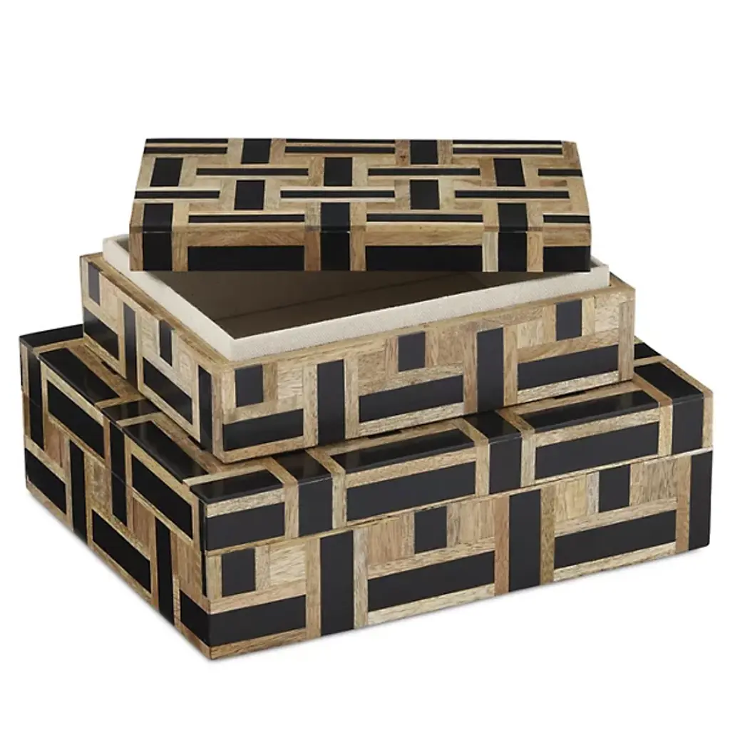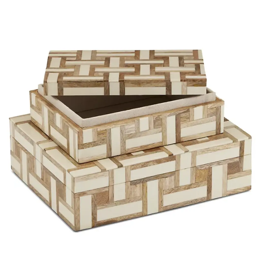 The Aarna Box, Set of 2, from Currey & Company, delivers a memorable mix of refined construction and contrasting textures. Perfect for storing small essentials, this set blends contemporary simplicity and mid-century modern influences. The rectangular boxes show off a blocky, basket-weave pattern combining natural wood inlay with composite strips for a bold, geometric look. The elongated design elements enhance the modern aesthetic, while the interiors are lined with soft white linen.