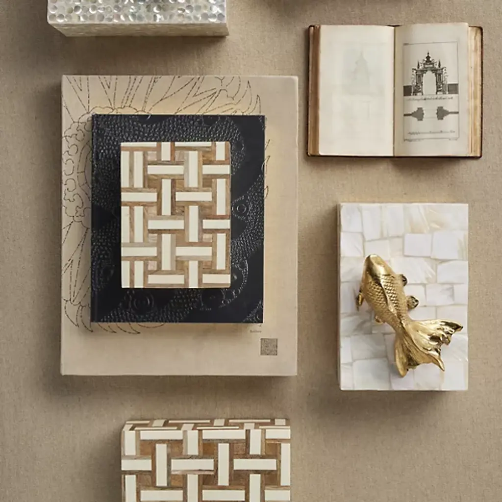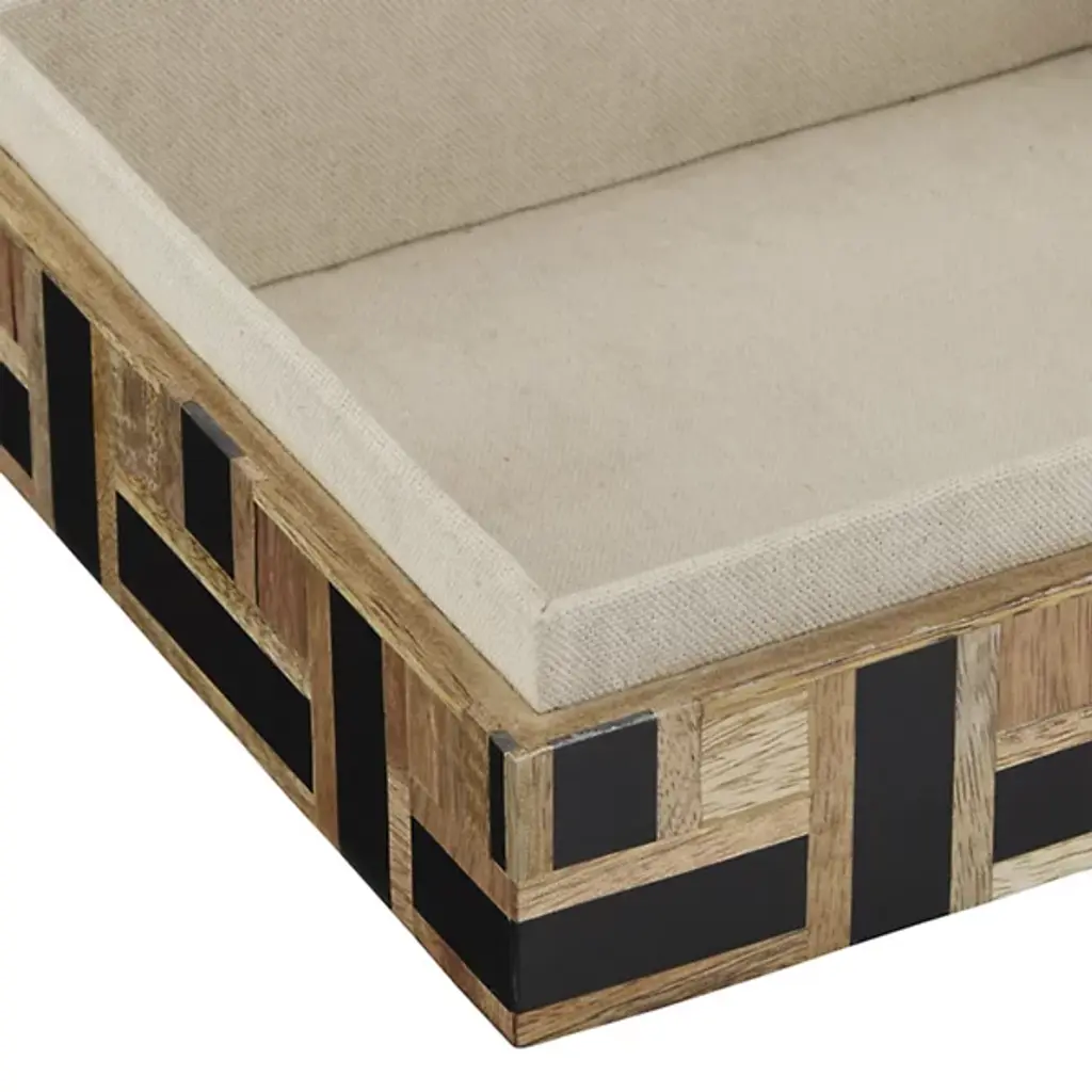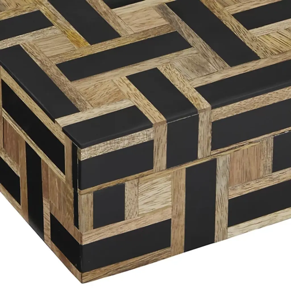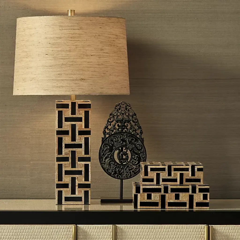 The Aarna Box, Set of 2, from Currey & Company, delivers a memorable mix of refined construction and contrasting textures. Perfect for storing small essentials, this set blends contemporary simplicity and mid-century modern influences. The rectangular boxes show off a blocky, basket-weave pattern combining natural wood inlay with composite strips for a bold, geometric look. The elongated design elements enhance the modern aesthetic, while the interiors are lined with soft white linen.