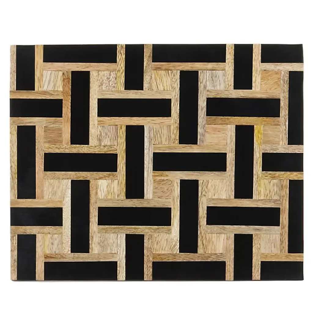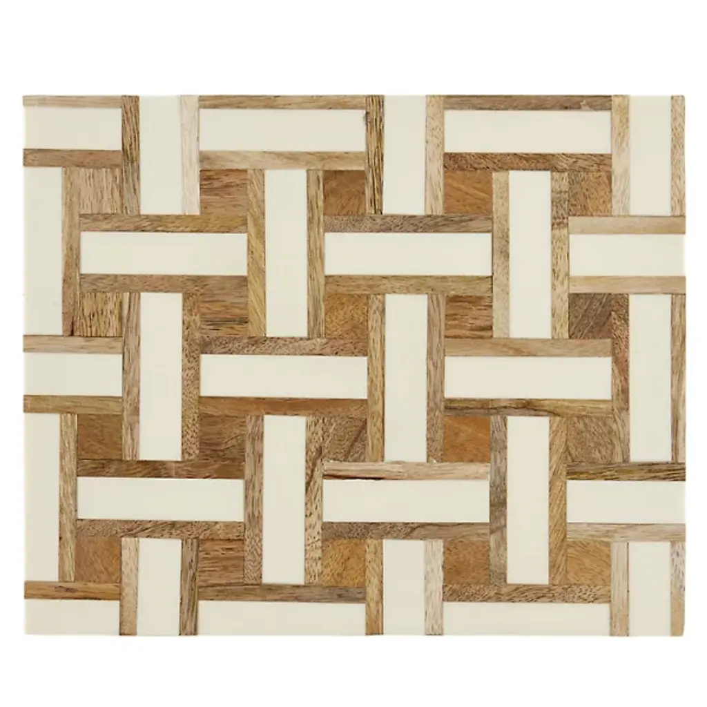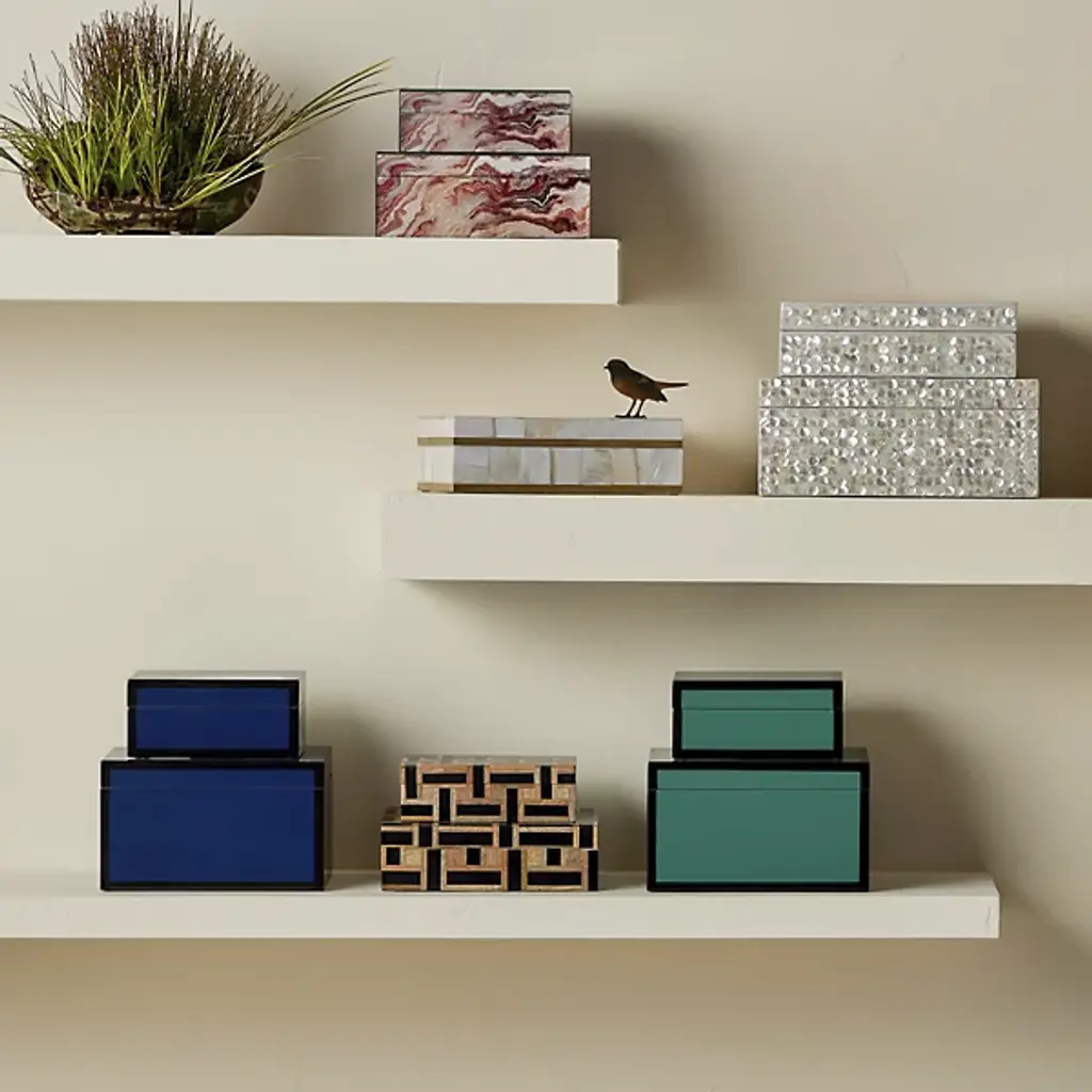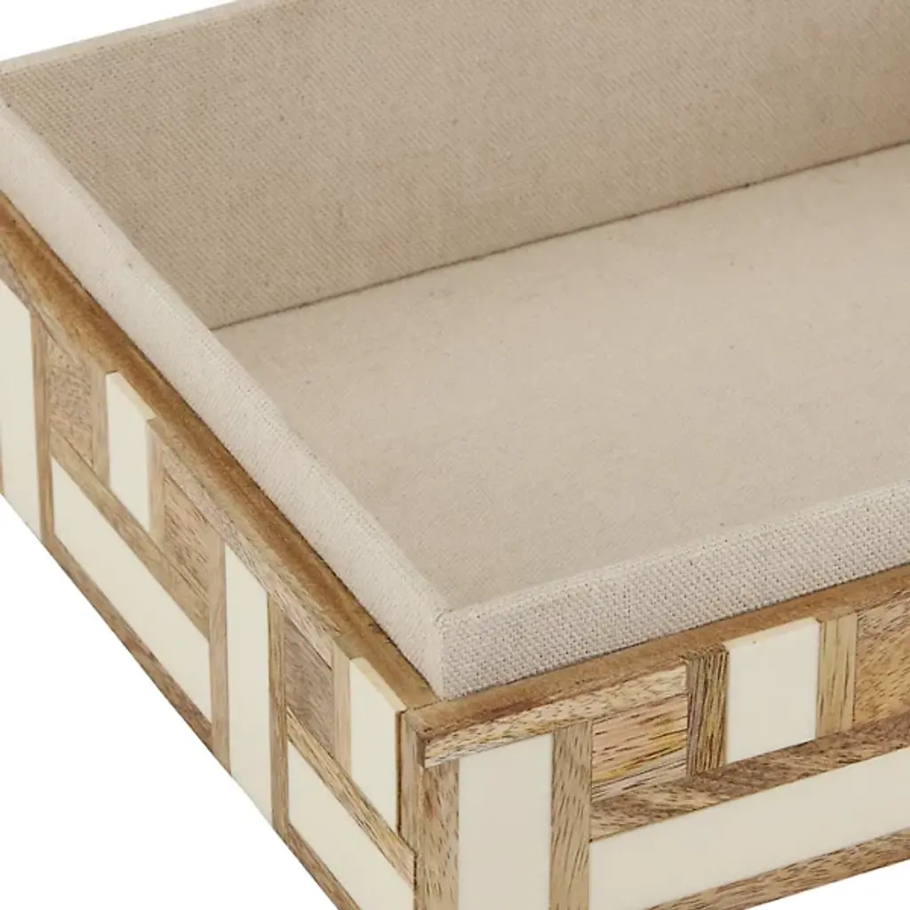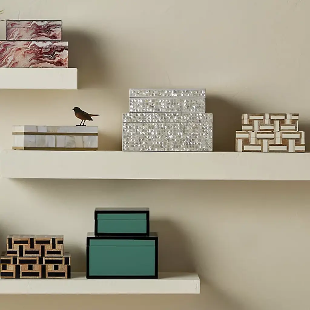 The Aarna Box, Set of 2, from Currey & Company, delivers a memorable mix of refined construction and contrasting textures. Perfect for storing small essentials, this set blends contemporary simplicity and mid-century modern influences. The rectangular boxes show off a blocky, basket-weave pattern combining natural wood inlay with composite strips for a bold, geometric look. The elongated design elements enhance the modern aesthetic, while the interiors are lined with soft white linen.