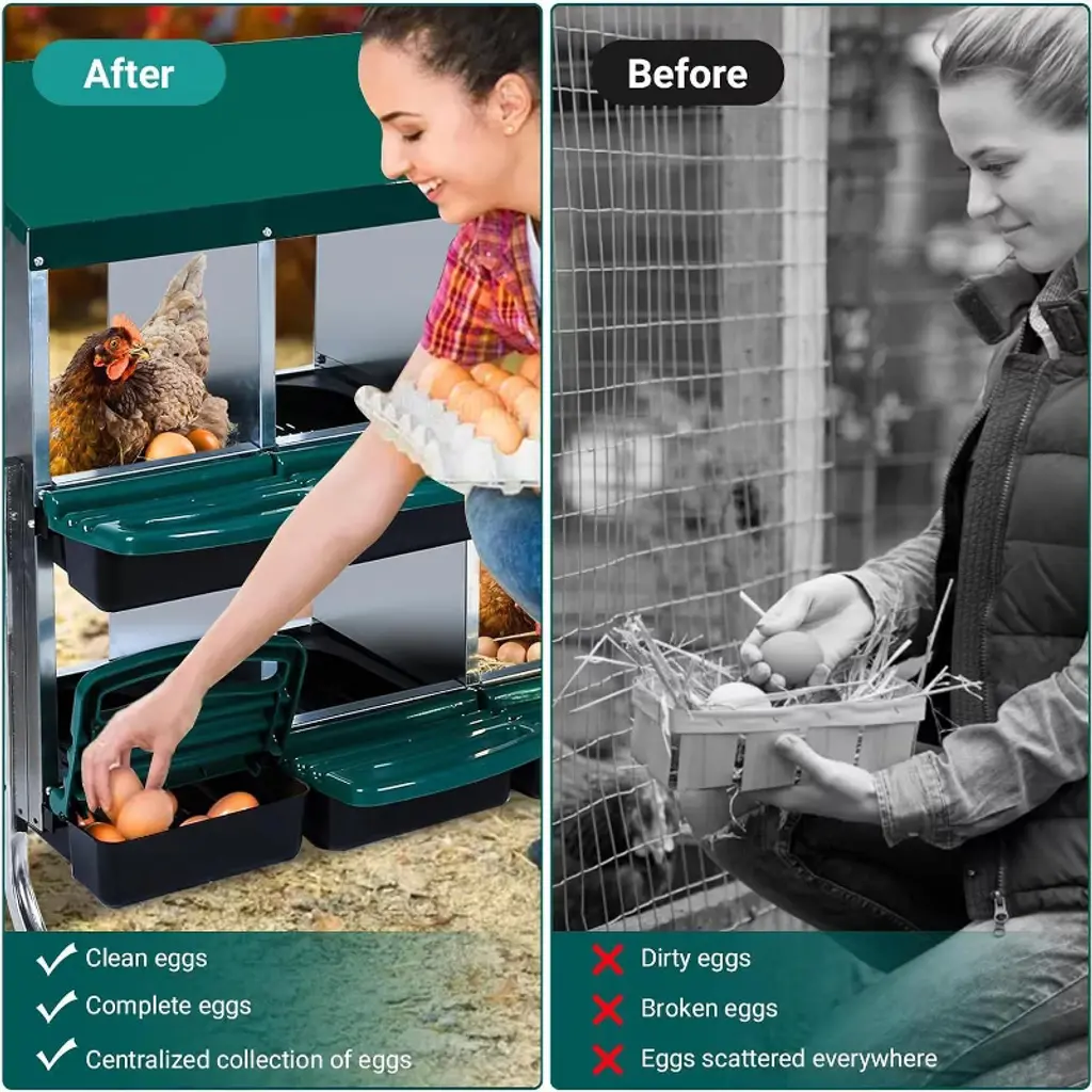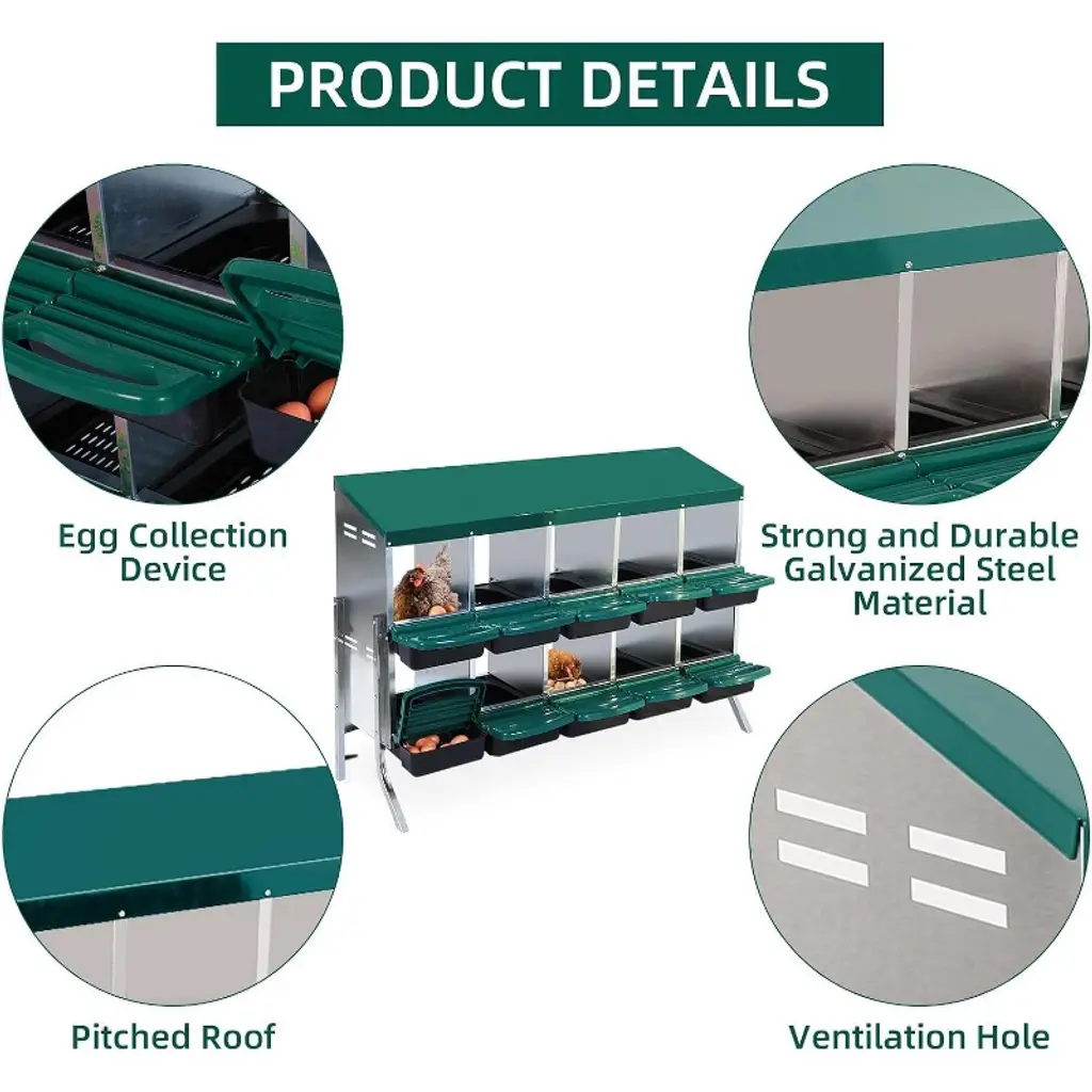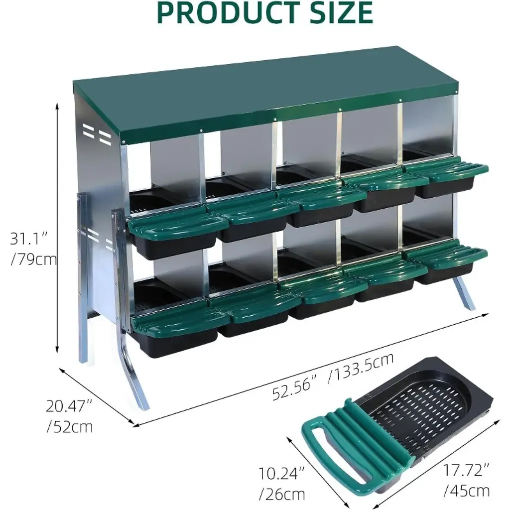 This 10-nest system combines smart design with durable construction for easier egg collection. Smart Features: ✔ Automatic egg rollaway ✔ Weather-resistant steel ✔ Ventilated nesting areas ✔ Easy-access collection trays ✔ Adjustable mounting options Specifications: Size: 42"W x 18"D x 12"H Nest Dimensions: 10"x10" each Recommended Height: 16-20" Weight: 21 lbs Color Options: Green, Blue, Red