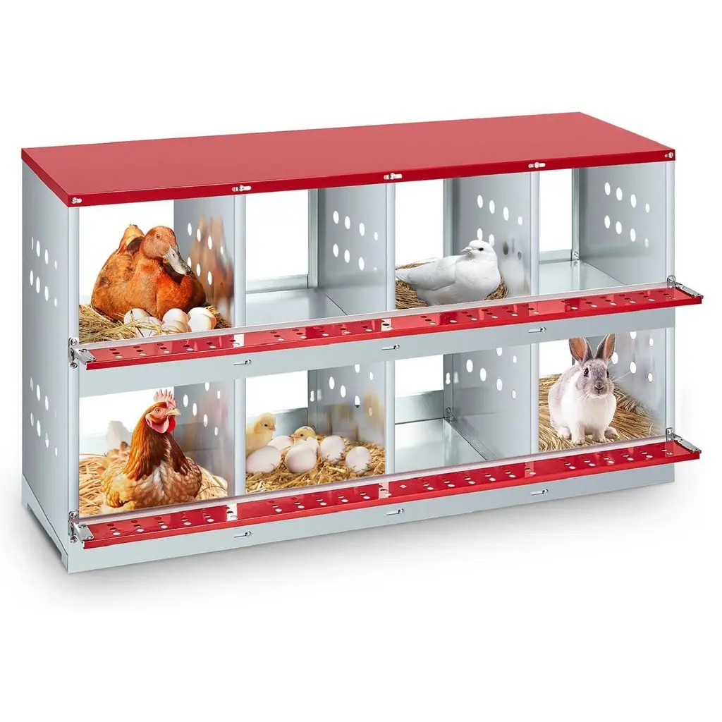 This 8-nest system combines comfort for chickens with convenience for you. Smart Features: ✔ 8 private nesting spaces ✔ Protected egg collection trays ✔ Weather-resistant steel ✔ Comfortable entry perch ✔ Quick-release cleanout Specifications: Size: 50"L x 19"W x 28"H Nest Dimensions: 10"W x 10"D x 9"H Recommended Height: 18-20" Weight: 22 lbs Color: Silver metal