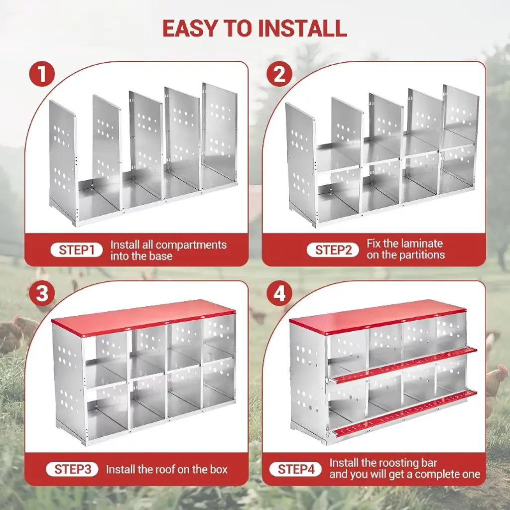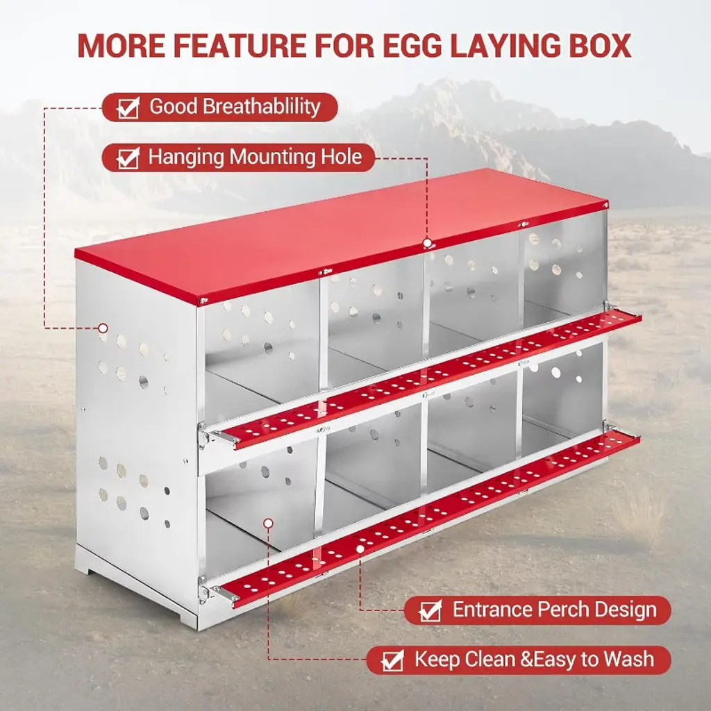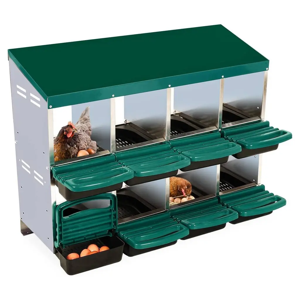 This 8-nest system combines comfort for chickens with convenience for you. Smart Features: ✔ 8 private nesting spaces ✔ Protected egg collection trays ✔ Weather-resistant steel ✔ Comfortable entry perch ✔ Quick-release cleanout Specifications: Size: 50"L x 19"W x 28"H Nest Dimensions: 10"W x 10"D x 9"H Recommended Height: 18-20" Weight: 22 lbs Color: Silver metal