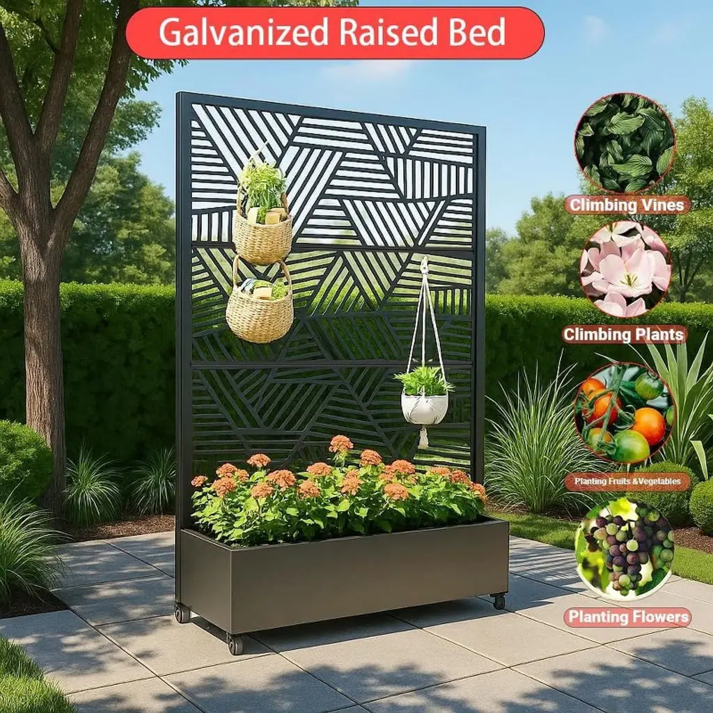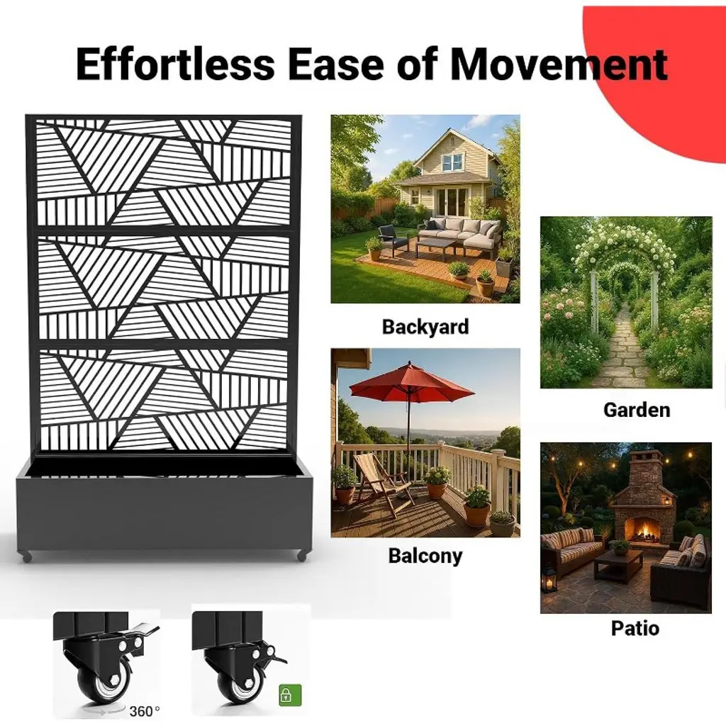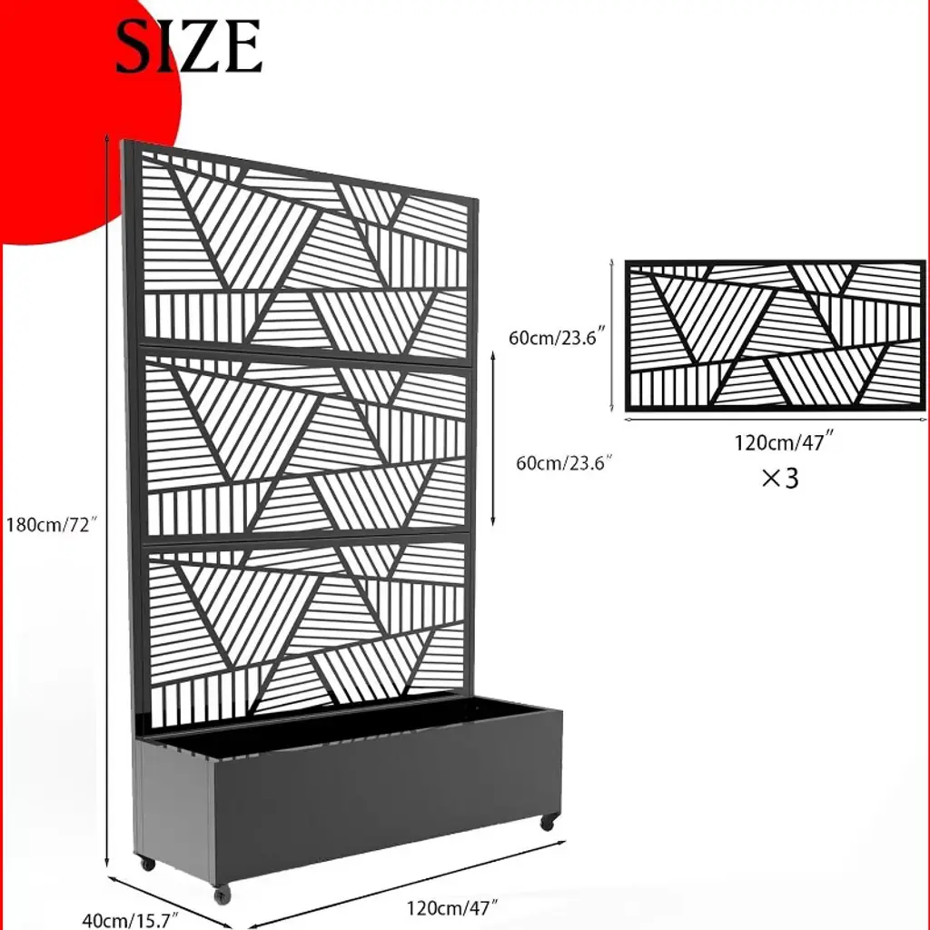 This 3-panel privacy screen combines functionality with an attractive design. The built-in planter box allows for growing climbing plants while creating privacy. Works well in patios, gardens or pool areas. Features decorative trellis panels that support plant growth. The deep planter box provides space for flowers or vegetables. Adjustable panel connections accommodate different space requirements. Measures 72"H x 47"W overall. Key Features: