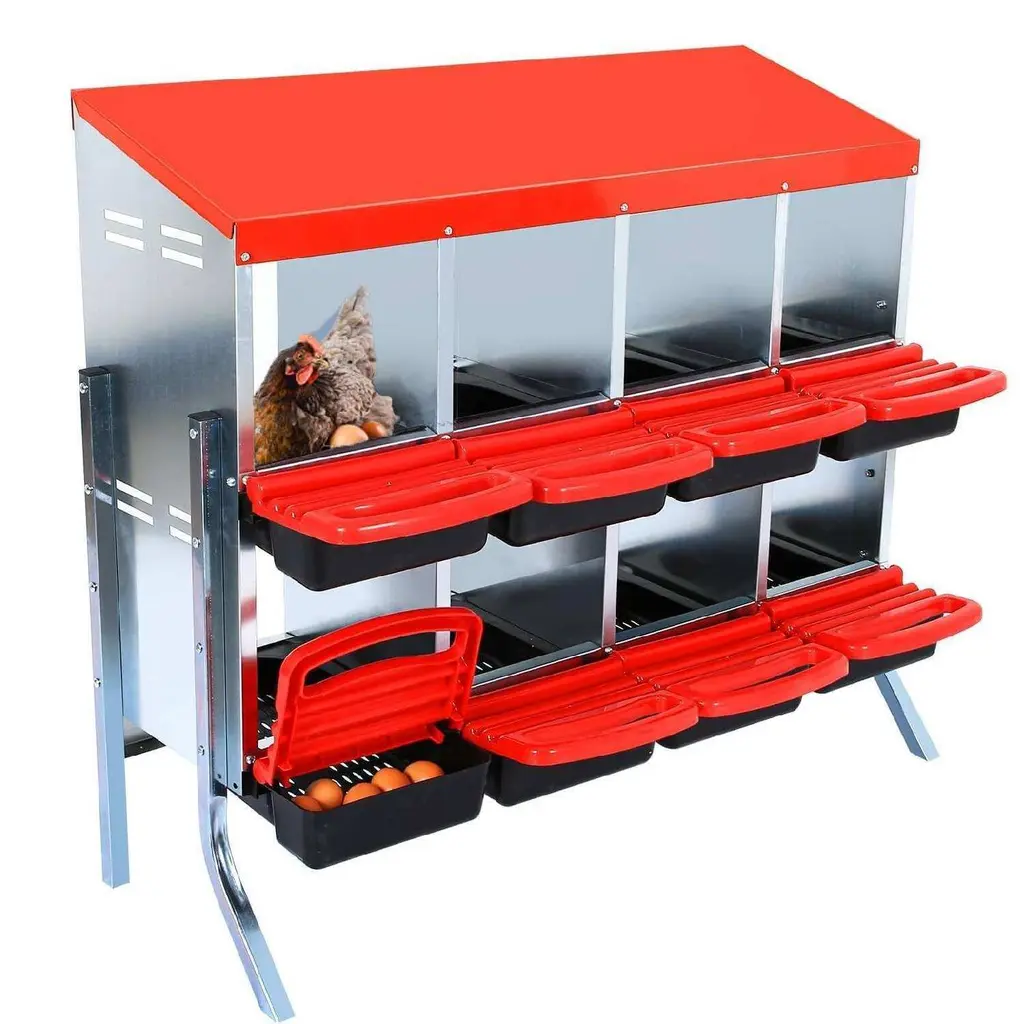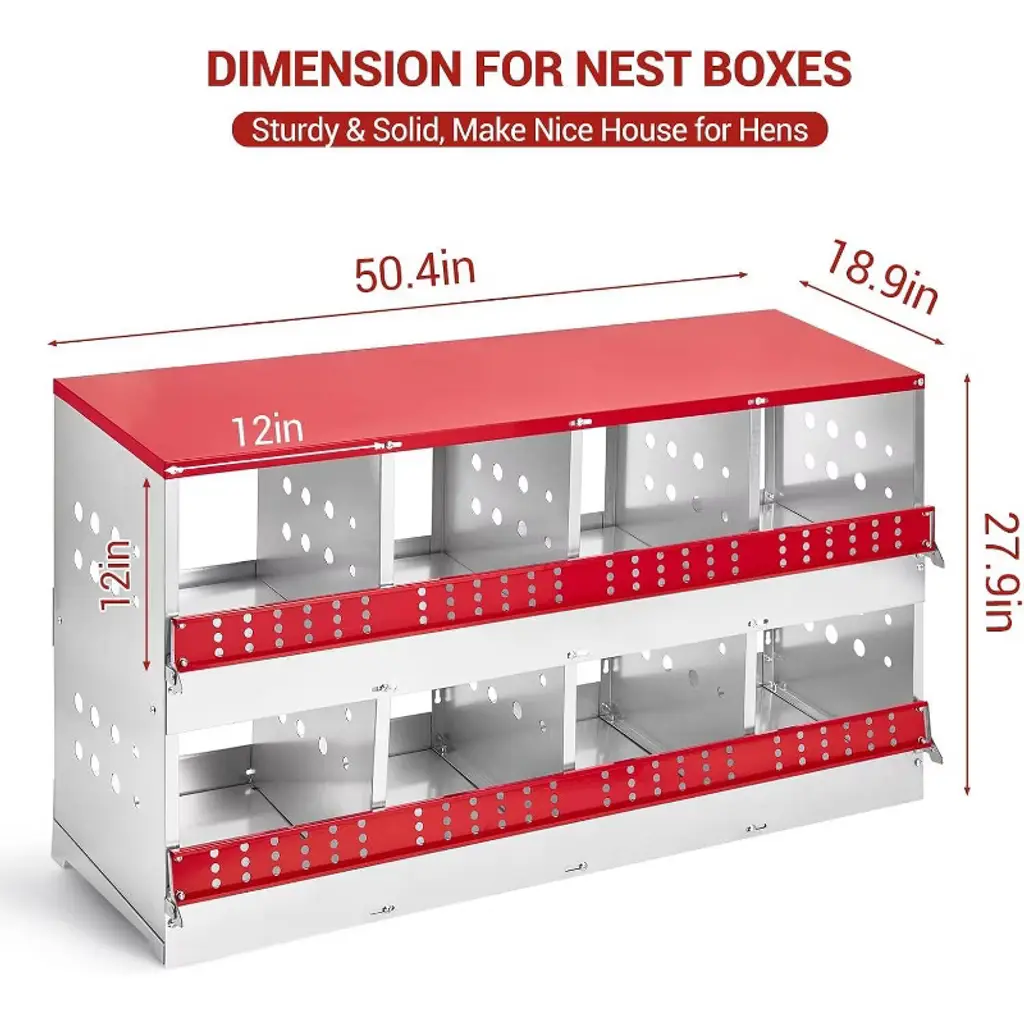 This 8-nest system combines comfort for chickens with convenience for you. Smart Features: ✔ 8 private nesting spaces ✔ Protected egg collection trays ✔ Weather-resistant steel ✔ Comfortable entry perch ✔ Quick-release cleanout Specifications: Size: 50"L x 19"W x 28"H Nest Dimensions: 10"W x 10"D x 9"H Recommended Height: 18-20" Weight: 22 lbs Color: Silver metal