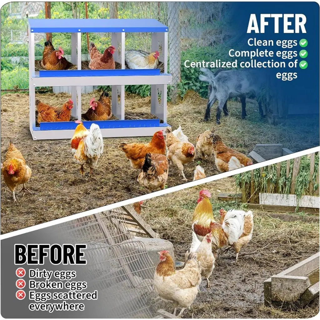 Description: Acekool Chicken Nesting Box offers a functional, secure, and easy-to-maintain solution for backyard and small farm poultry keepers. Designed to support healthy laying habits, the nest box features a smooth rollaway system so eggs stay clean and undamaged. Spacious compartments ensure hens feel safe and private when laying, which encourages more eggs with less stress for your flock. Features: Constructed from fully galvanized alloy steel for year-round weather resistance, this box includes rust-proof plastic trays and a reinforced frame. Large vent holes provide airflow and help keep the nesting area fresh. The removable egg tray collects eggs gently and keeps them clean and easy to reach. Drainage holes in the tray ensure quick drying, so the nests remain dry through all seasons. Quick installation needs no tools thanks to clear assembly markings—just snap the parts together and mount the box at your preferred height. Choose versions with support legs for added stability. Specifications: Body: Galvanized alloy steel Tray: Removable plastic, with drainage Compartments: 6, 8, or 10 Colors: Blue, Orange Support: Support leg option available Egg Collection: Rollaway decline design Assembly: Tool-free, pre-drilled, instructions included Ventilation: Large airflow holes Recommended use: Chicken coops, small farms, backyard poultry