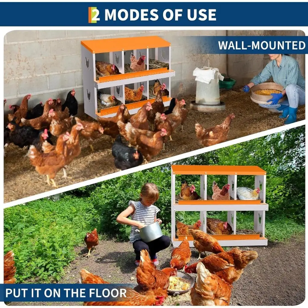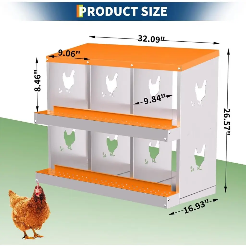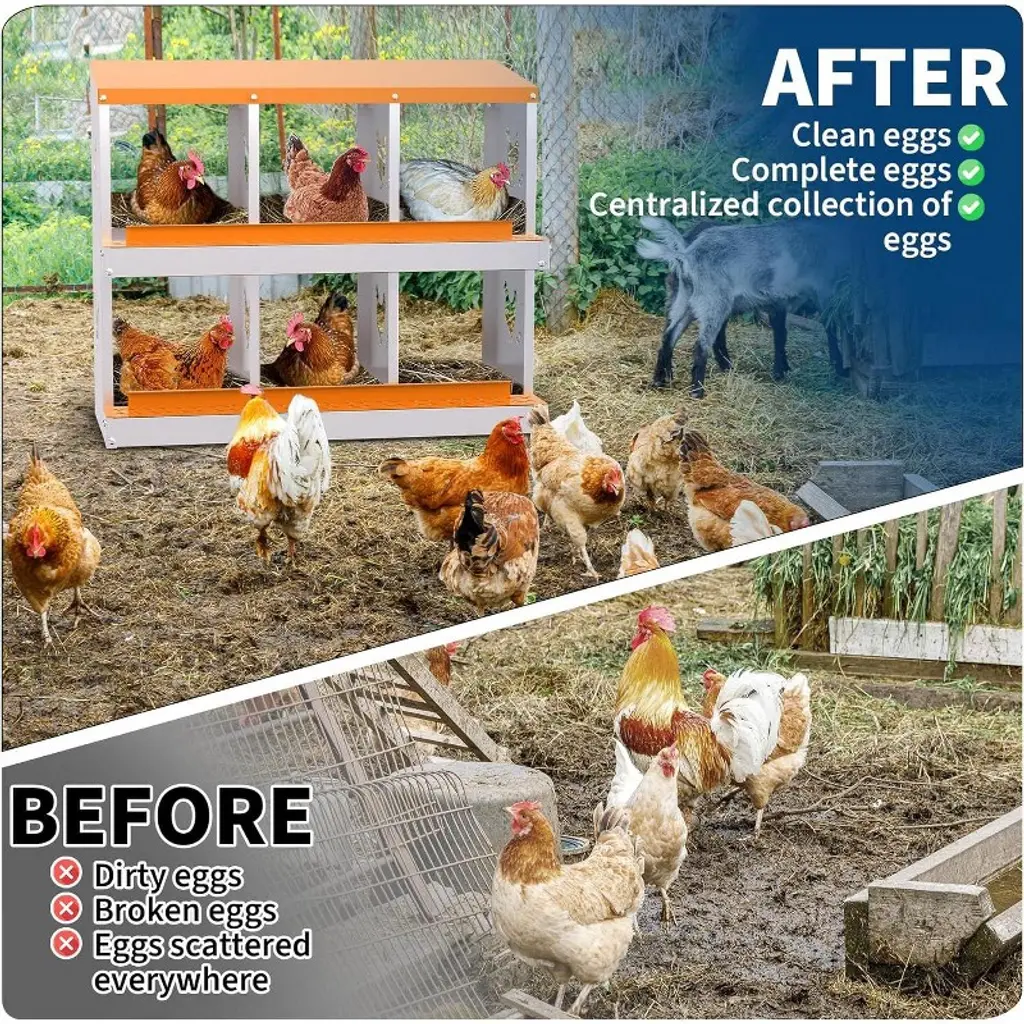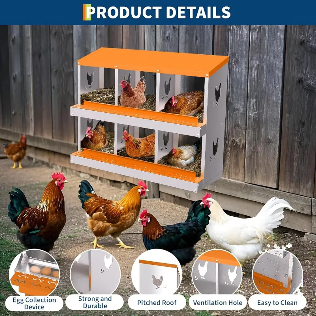 Description: Acekool Chicken Nesting Box offers a functional, secure, and easy-to-maintain solution for backyard and small farm poultry keepers. Designed to support healthy laying habits, the nest box features a smooth rollaway system so eggs stay clean and undamaged. Spacious compartments ensure hens feel safe and private when laying, which encourages more eggs with less stress for your flock. Features: Constructed from fully galvanized alloy steel for year-round weather resistance, this box includes rust-proof plastic trays and a reinforced frame. Large vent holes provide airflow and help keep the nesting area fresh. The removable egg tray collects eggs gently and keeps them clean and easy to reach. Drainage holes in the tray ensure quick drying, so the nests remain dry through all seasons. Quick installation needs no tools thanks to clear assembly markings—just snap the parts together and mount the box at your preferred height. Choose versions with support legs for added stability. Specifications: Body: Galvanized alloy steel Tray: Removable plastic, with drainage Compartments: 6, 8, or 10 Colors: Blue, Orange Support: Support leg option available Egg Collection: Rollaway decline design Assembly: Tool-free, pre-drilled, instructions included Ventilation: Large airflow holes Recommended use: Chicken coops, small farms, backyard poultry