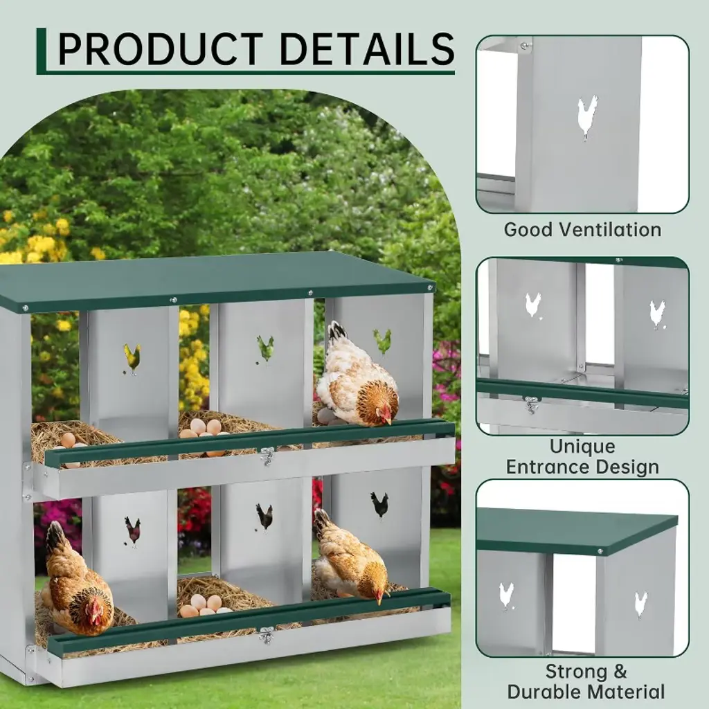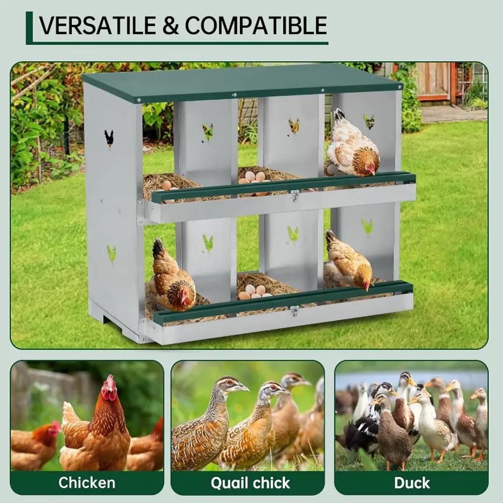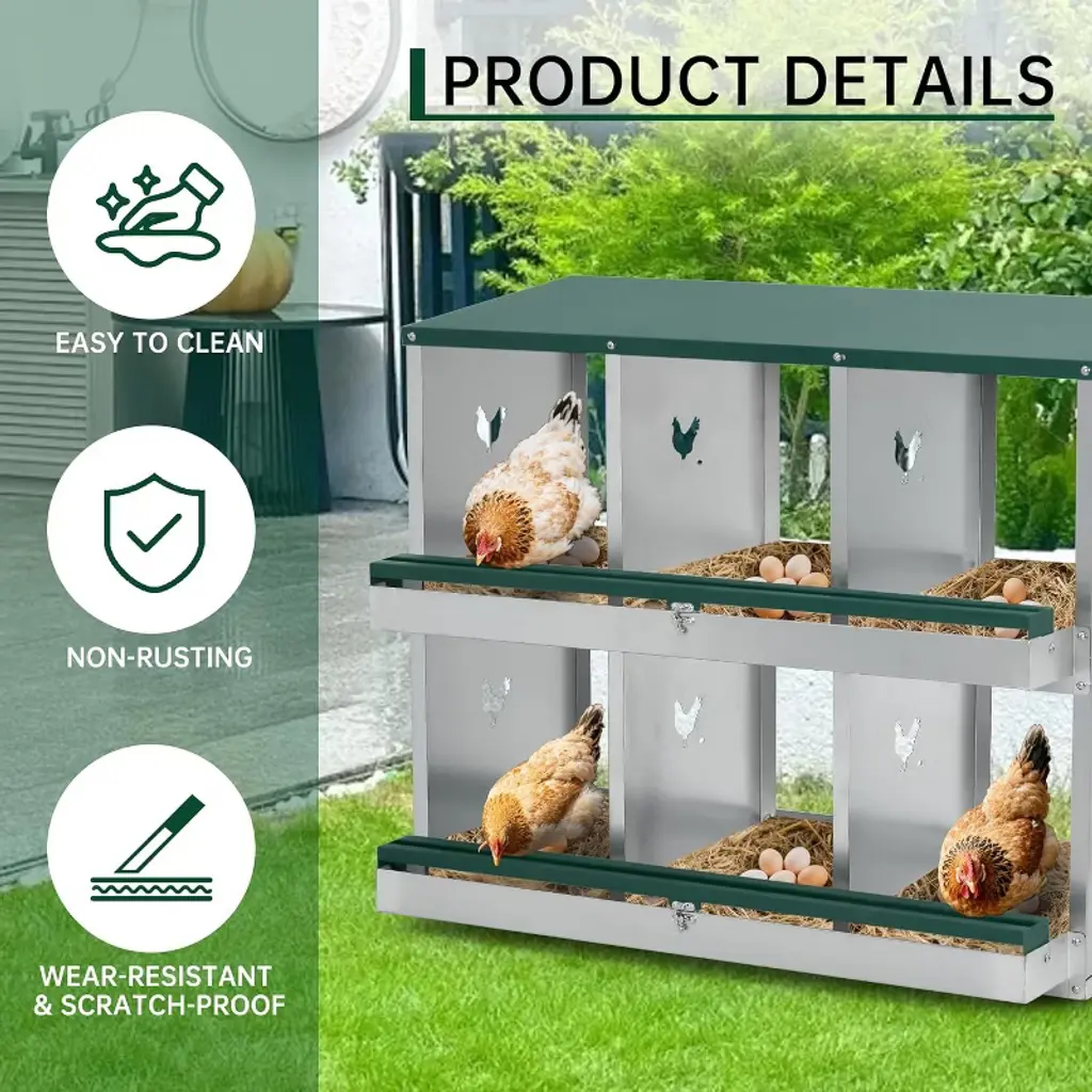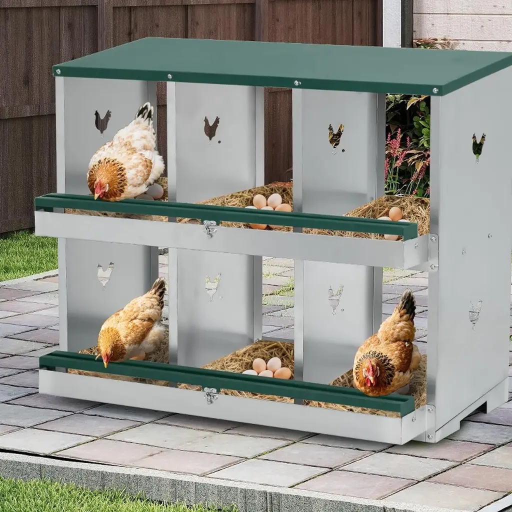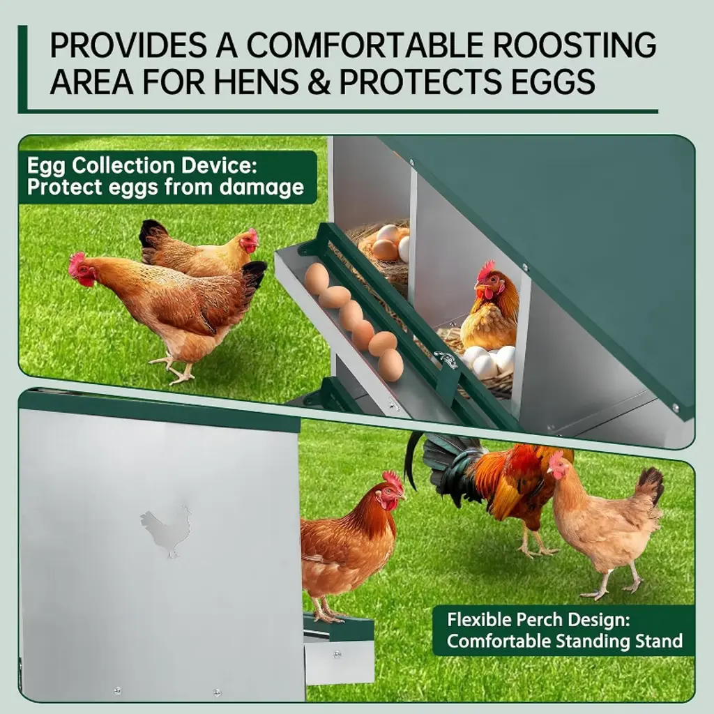 Description: The Acekool Metal Chicken Nesting Box provides a practical, secure, and comfortable space for hens to lay eggs, streamlining collection and supporting healthy flocks. With a choice of single or double tier, and up to 8 compartments, it offers flexibility and convenience for backyard and farm use. Its robust steel design and spacious nesting areas make this box a favorite among poultry owners aiming to maximize egg production and minimize stress. Features: Built from galvanized carbon steel, this nesting box stands up to tough daily use and weather. Large vented holes allow for continuous airflow and reduce odors in the coop. The roomy compartments give each chicken the privacy and comfort needed for regular laying, while the easy-to-remove tray beneath each row keeps the nest area dry and tidy. The water-resistant structure prevents water accumulation, and the open design ensures quick access for egg retrieval and maintenance. Specifications: Structure: Carbon steel, galvanized finish Compartments: 3, 4, 6, or 8 (single or double tier) Compartment Size: Each about 12" x 11" Ventilation: Large vent holes for airflow Cleaning: Removable trays for easy cleaning Color Options: Orange-red, Green Assembly: Quick setup with instruction manual included Recommended Use: Chicken coops, backyard farms, small livestock areas