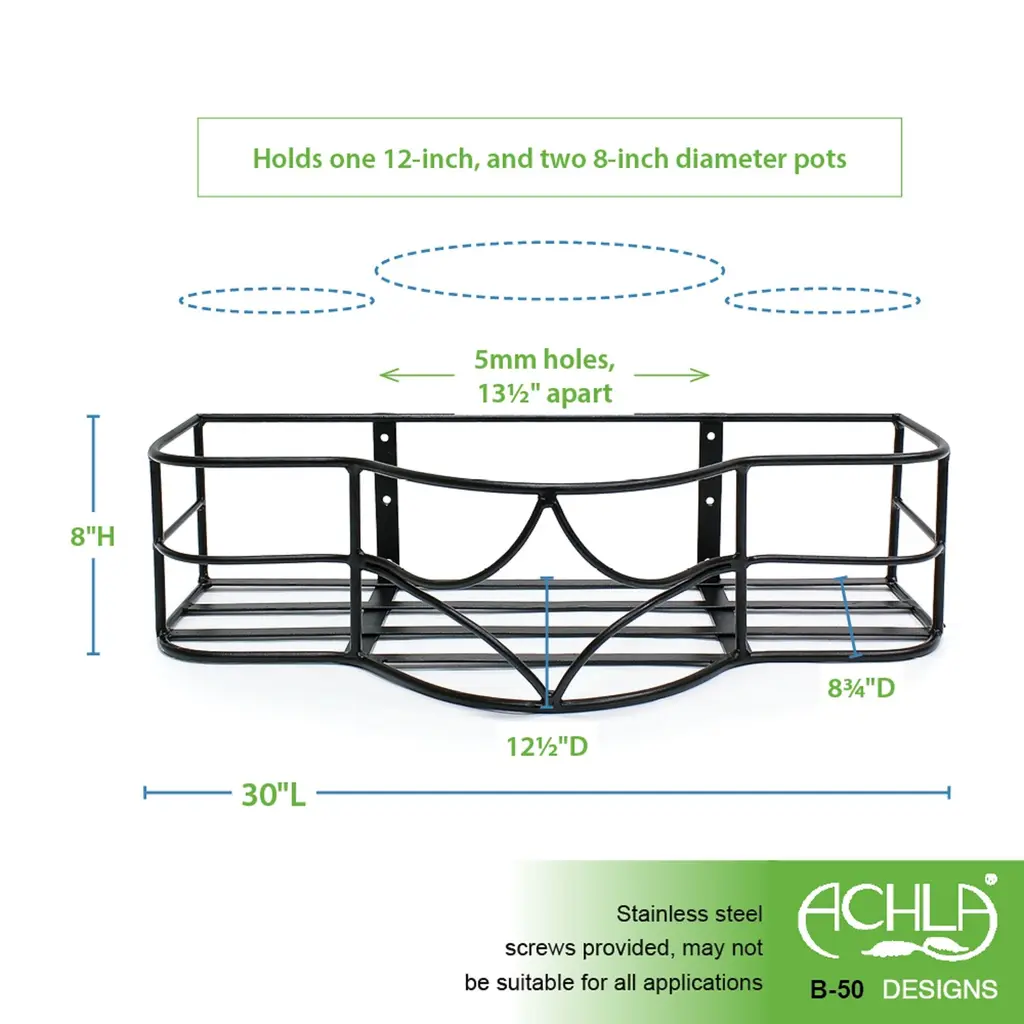 Introduce your window ledge to a touch of European-inspired elegance with the Achla Designs Argyle Window Box. This box is designed to hold two 8 inch and one 10 inch flower pots, and is made of durable wrought iron with a black powder coated finish for maximum weather resistance. Secure with non-rusting hardware appropriate for the application and enjoy the timeless beauty of the Argyle Window Box.Features:Additional Details:
