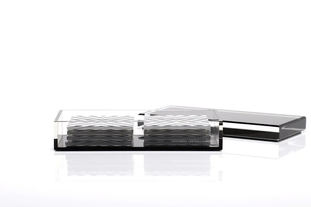 The Alexandra Von Furstenberg Shorty Box in Black are both decorative and functional. Featuring a sleek, low-profile design, these boxes are versatile for various uses. Place the AVF Shorty Box on your coffee table to hold remote controls, on your desk to organize pens and pencils, or on your bedside table to store a book. Made from high-quality acrylic and hand-polished, these boxes make a brilliant centerpiece for any setting.