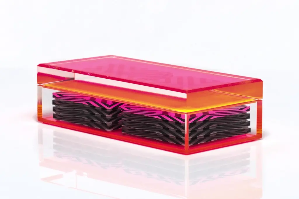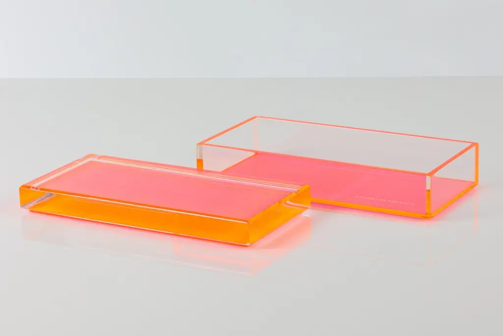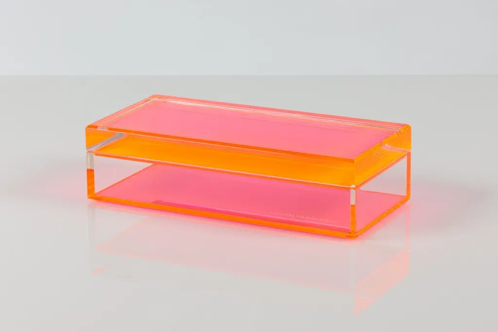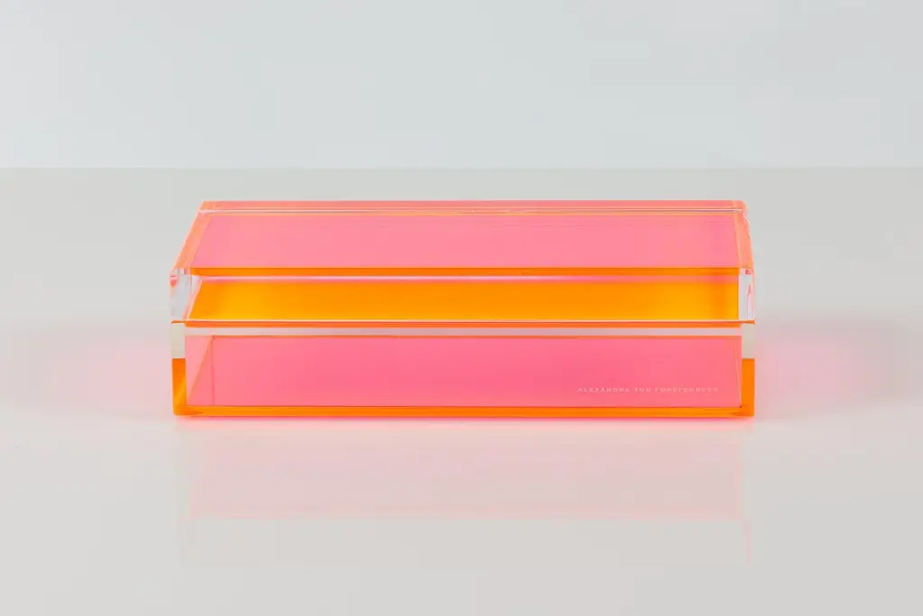 The Alexandra Von Furstenberg Shorty Box in Pink are both decorative and functional. Featuring a sleek, low-profile design, these boxes are versatile for various uses. Place the AVF Shorty Box on your coffee table to hold remote controls, on your desk to organize pens and pencils, or on your bedside table to store a book. Made from high-quality acrylic and hand-polished, these boxes make a brilliant centerpiece for any setting.
