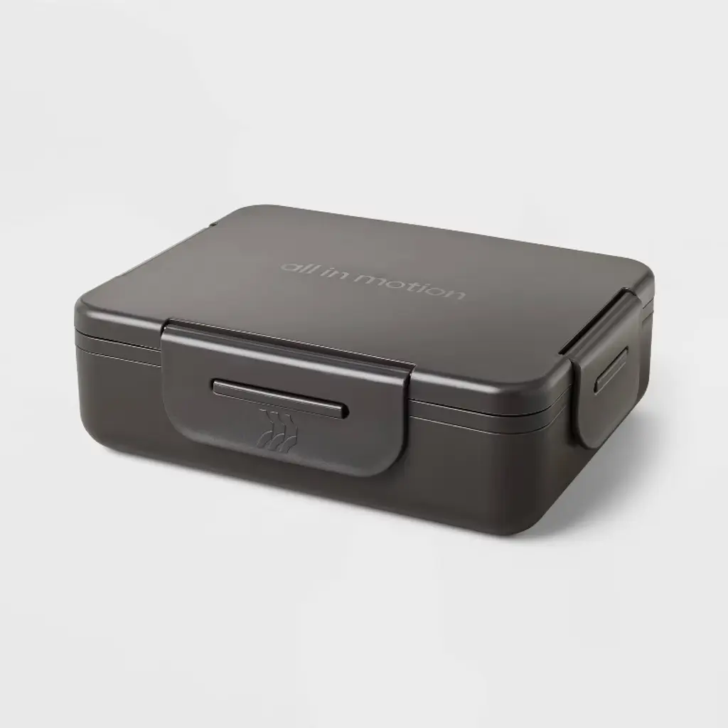 Why we're ALL IN:Rectangular bento box made from recycled polypropylene (rPP). Divided into three sections for easy food organization. Comes with a separate small-sized bento box to hold dips and sauces, and includes a spoon and fork for eating. Sports a latch closure for convenient storage and dishwasher safe on top rack only for quick cleaning. All in Motion™: Inspiring the potential in every body.