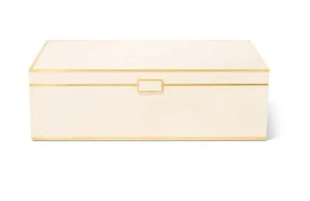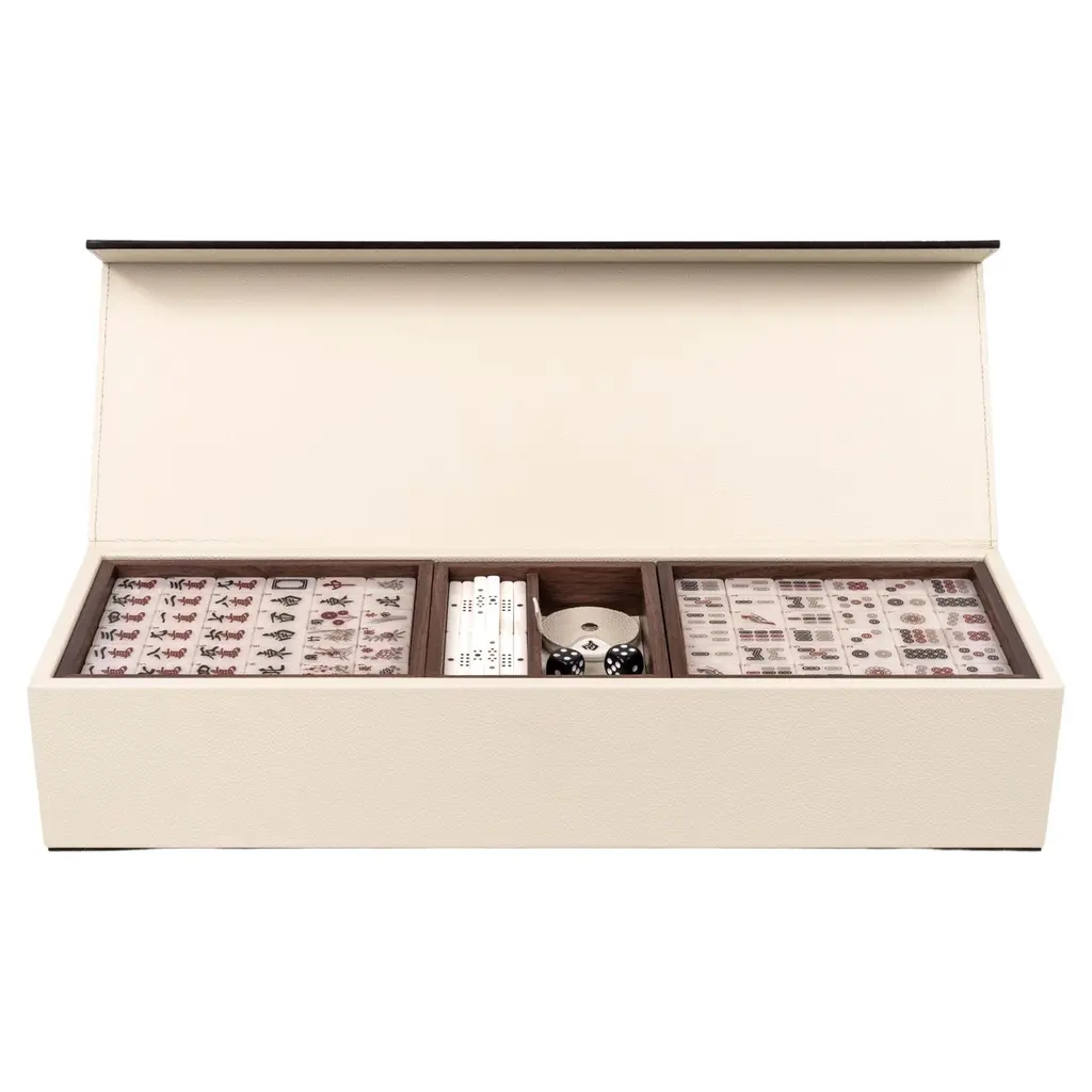 Presented in a faux shagreen box with brass detailing, this set of five games includes a removable, hinged board with backgammon on one side, and chess / checkers on the other. A removable tray in mappa burl holds domino tiles, cards, backgammon tiles, a doubling cube, and two dice holders. A second tray, also in mappa burlwood, holds stylized chess pieces in black and brass finishes. Embossed faux shagreen, brass hardware, suede lining, wood veneer Dimensions: 21.5" x 12.5" x 6.7" Care Instructions: Keep out of direct sunlight to avoid fading. Clean faux shagreen with a damp cloth