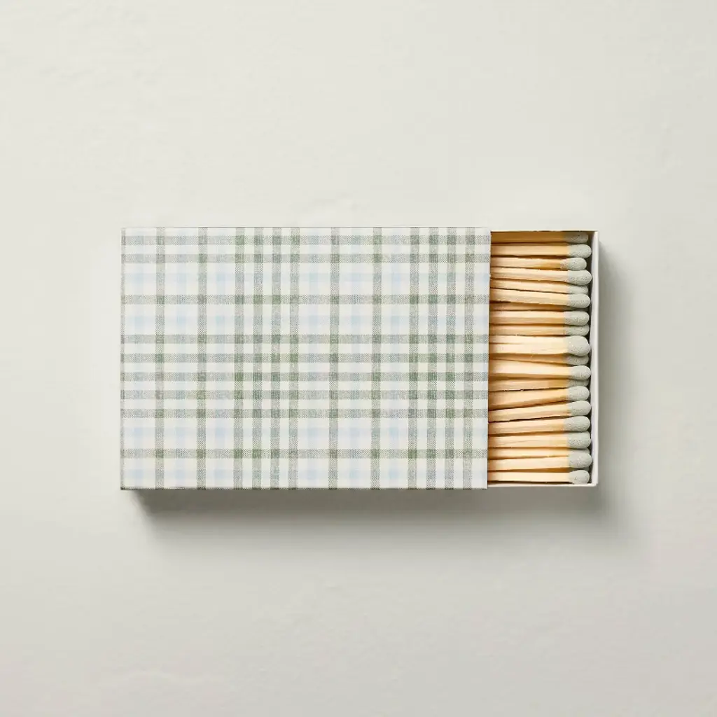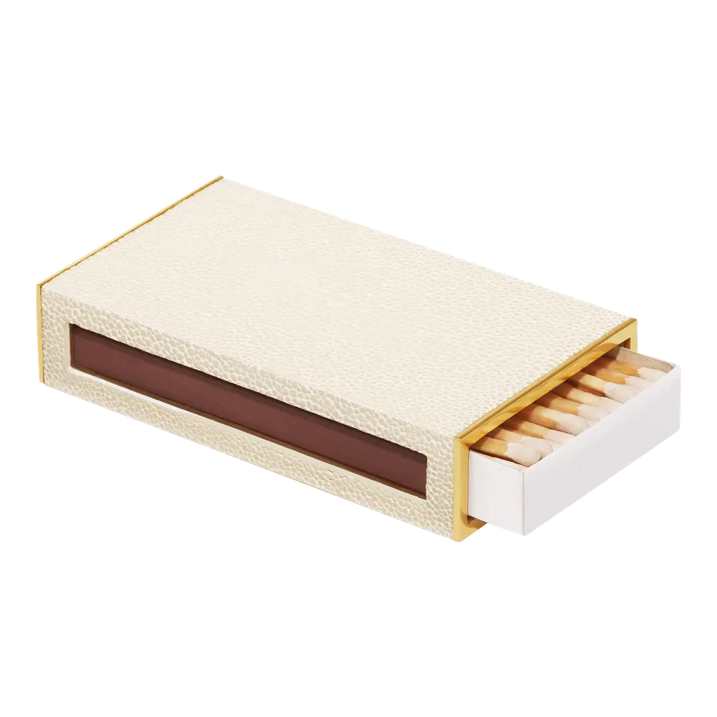 A beautiful faux shagreen box holds oversized matches and includes an opening to reveal the interior strike card. It looks beautiful on a tabletop beside one of the scented candles from the AERIN collection. Keep out of direct sunlight to avoid fading. Clean faux shagreen with a damp cloth