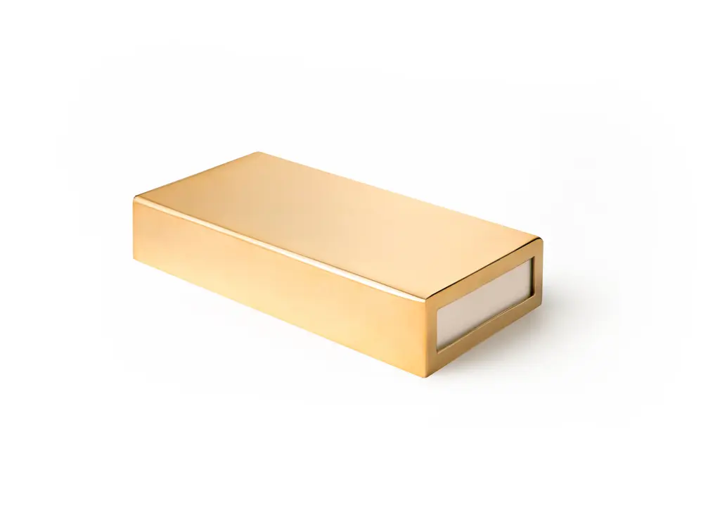 A beautiful solid brass box to hold oversized matches, this piece features a cutout on one side for a matchbox’s strike area. AERIN matches are included with each matchbox. Polish with brass polish.
