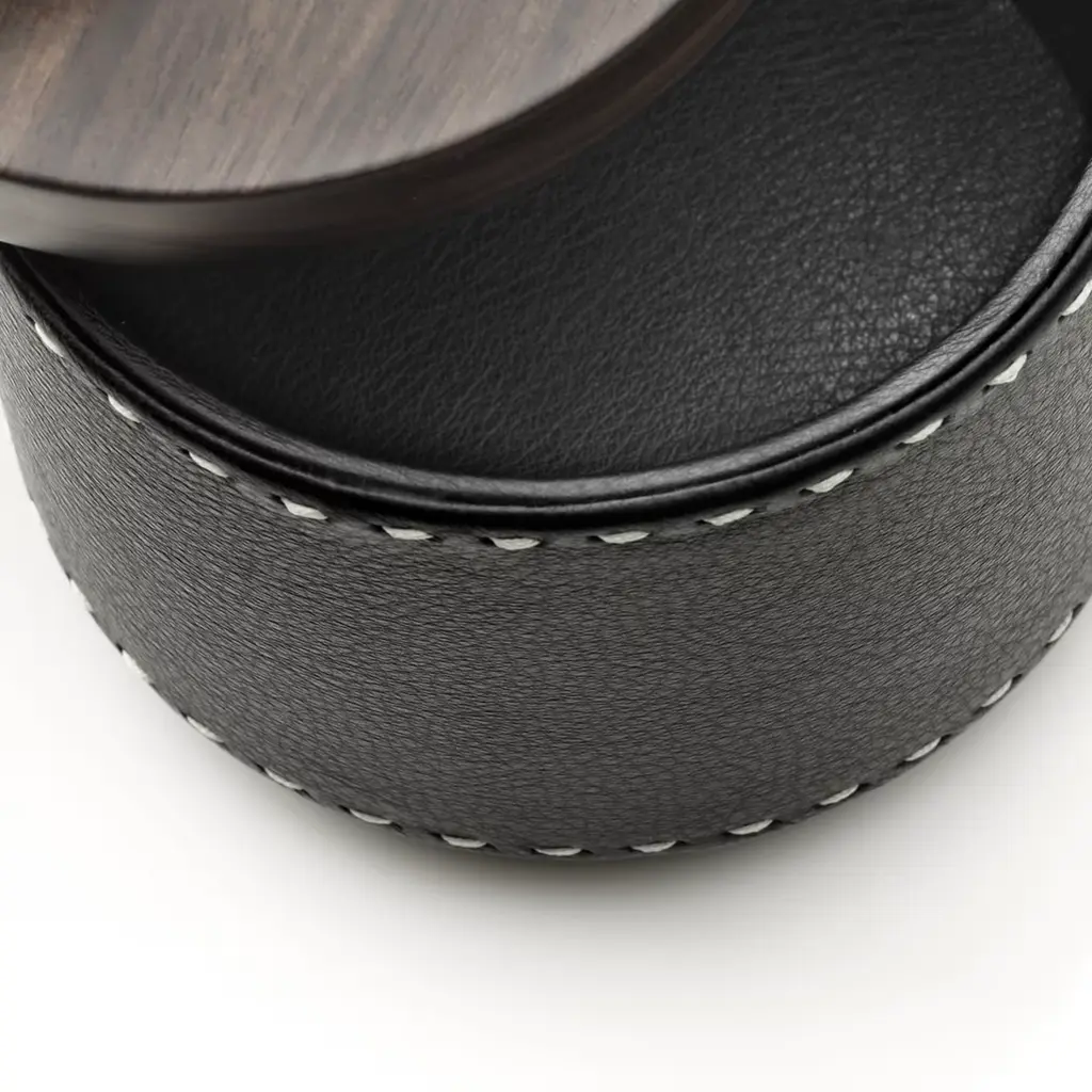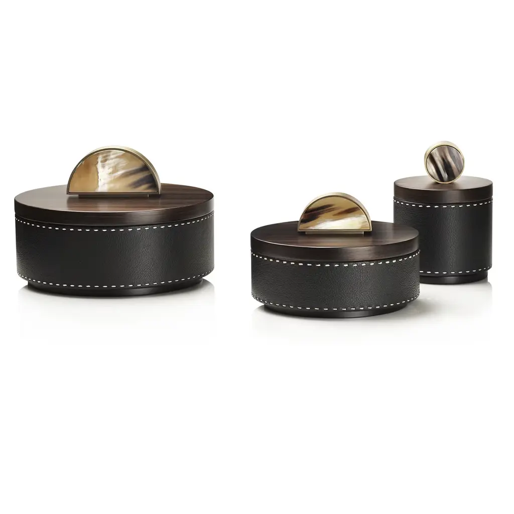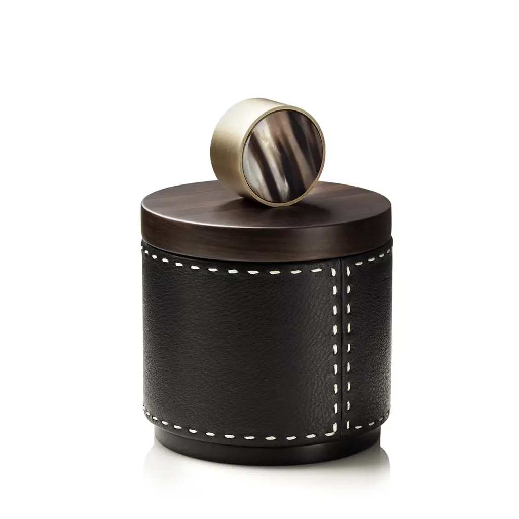 Round box in Aida pebbled leather, Onyx color with handmade ivory stitching. Lid in matte Amara ebony veneer with round handle in horn and burnished brass. Please, contact the Concierge for further information.