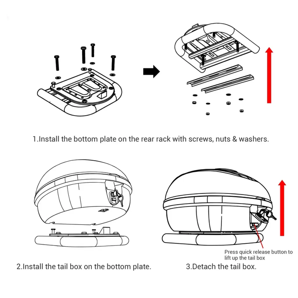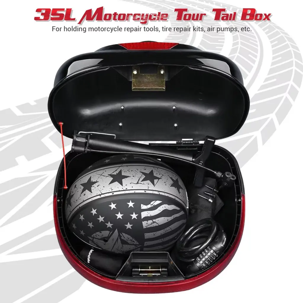 Features:- 35L Large Capacity - 17" x 15" x 11" Motorcycle Tour Tail Box features 35L large storage capacity for easy holding 1pc helmet including full face helmets or half face helmets, also allowing you to keep your raincoats, bags, water bottles, motorcycle covers, laptops, cameras, motorcycle repair tools, etc., suitable for commuters or travelers- Stylish Style & Night Reflector - Features a streamlined design with jet-black & smooth surface, delivering cool sports style and showing your unique taste, along with reflective strips on the tail box to improve visibility when riding at night, ensuring a safe ride- Durable & Safe - Made of high-quality and sturdy PP material, it provides resistance against water, wear, scratch and impact, ensuring a long lifespan and easy cleaning, along with an electroplated metal mounting plate for ensuring durability; Comes with a safety lock with 2 keys for protecting your personal items- Quick Release Button - Equipped with a quick release button for easily detaching the tail box from the bottom plate, allowing you to take it out and conveniently carry with your personal items wherever you go- Great Compatibility & Easy Installation - Compatible with motorbikes, scooters, cruisers or other motorcycles with rear luggage rack; Comes with a universal mounting plate, brackets, screws & nuts for easily attaching the tail box to the rear rack of your motorcycleSpecifications:- Overall Dimension(LxWxH): 17 5/16" x 14 15/16" x 11" (44 x 38 x 28 cm)- Internal Dimension(LxW): 15 3/4" x 11" (40 x 28 cm)- Capacity: 35 L- Net Weight: 6.17 Lbs (2.8 kg)Package Contents:- 1x Motorcycle Tail Box- 1x Bottom Plate- 2x Keys- 2x Brackets- 1 Set of Installing Accessories- 1x Manual