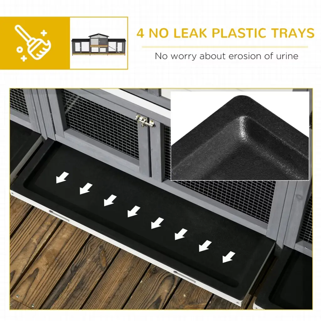 The main house and each run box of this rabbit hutch outdoor have built-in slide-out trays underneath, making cleaning this hutch super-easy.Anti pollution material upgrade, tray substrate selected with special surface treatment to eliminate dirt accumulation gaps.And the space is relatively large, which makes the actual use of space very objective, bringing comfortable experience to animals while also facilitating cleaning