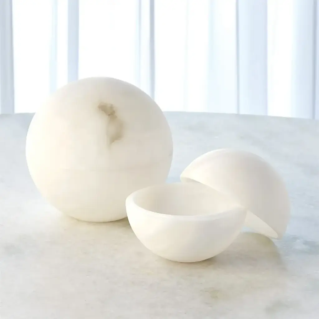 Beautifully carved alabaster sphere boxes with flattened bottom edge. The spheres are cut in half and hollowed out for storage use. As alabaster is a natural product, please be aware that there will always be variations in veining and color. This is to be expected and makes every alabaster product uniquely your own. From a fashion forward perspective, Global Views offers accessories, furniture, statement lighting, and an assortment of rugs and mirrors to add beauty and joy to your home.
