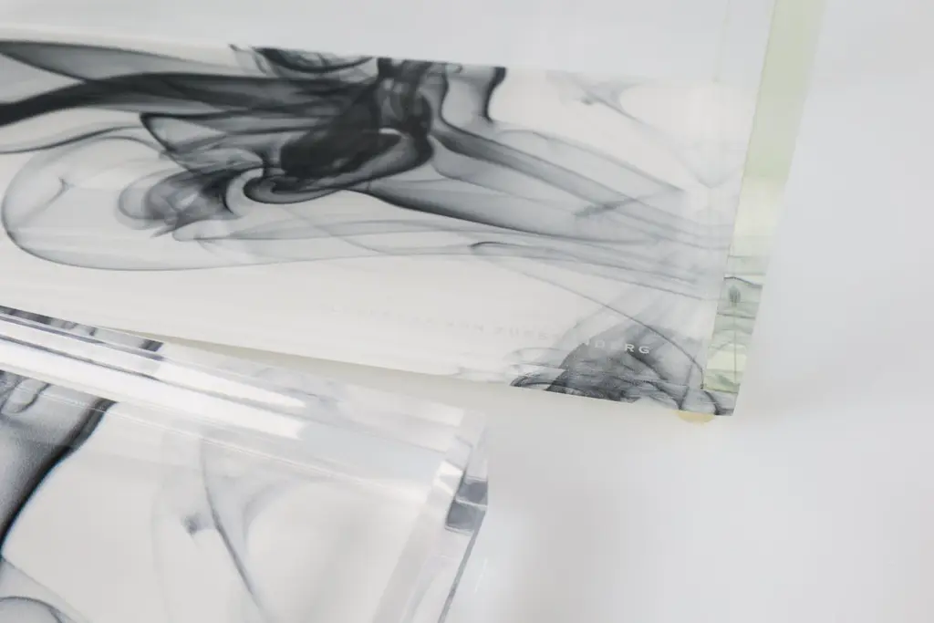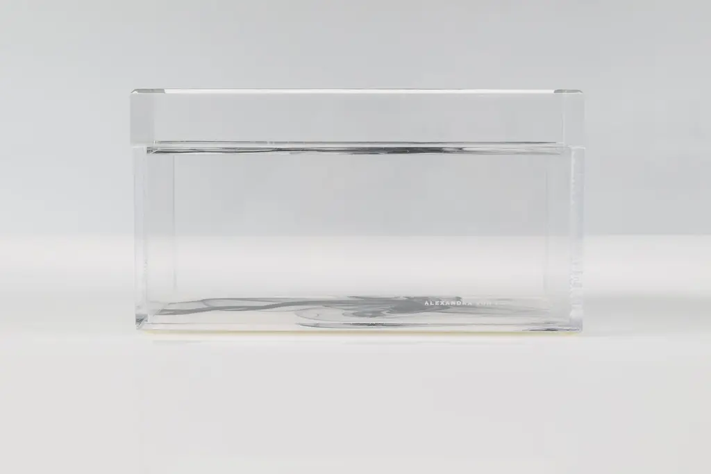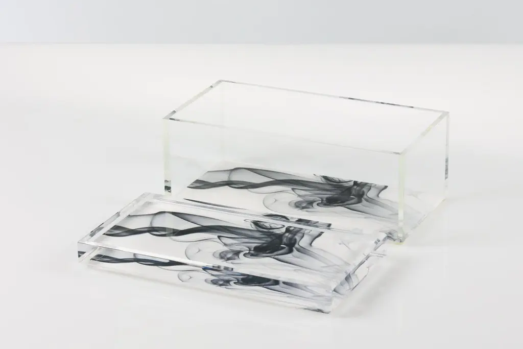 Add a bold pop of modern glamour to your space with this acrylic treasure box by Alexandra Von Furstenberg, featuring a striking black and white Black Smoke pattern. Made from high-quality Lucite, this chic decorative storage box is perfect for holding jewelry, keys, or other small treasures. Its contemporary geometric design makes it a stylish accent on a vanity, coffee table, or entry console. A statement piece for lovers of modern, minimalist, or high-gloss decor.Available in two sizes:Medium: 8" W x 4" D x 4.375" H - $455Large: 10" W x 5" D x 4.875" H - $515