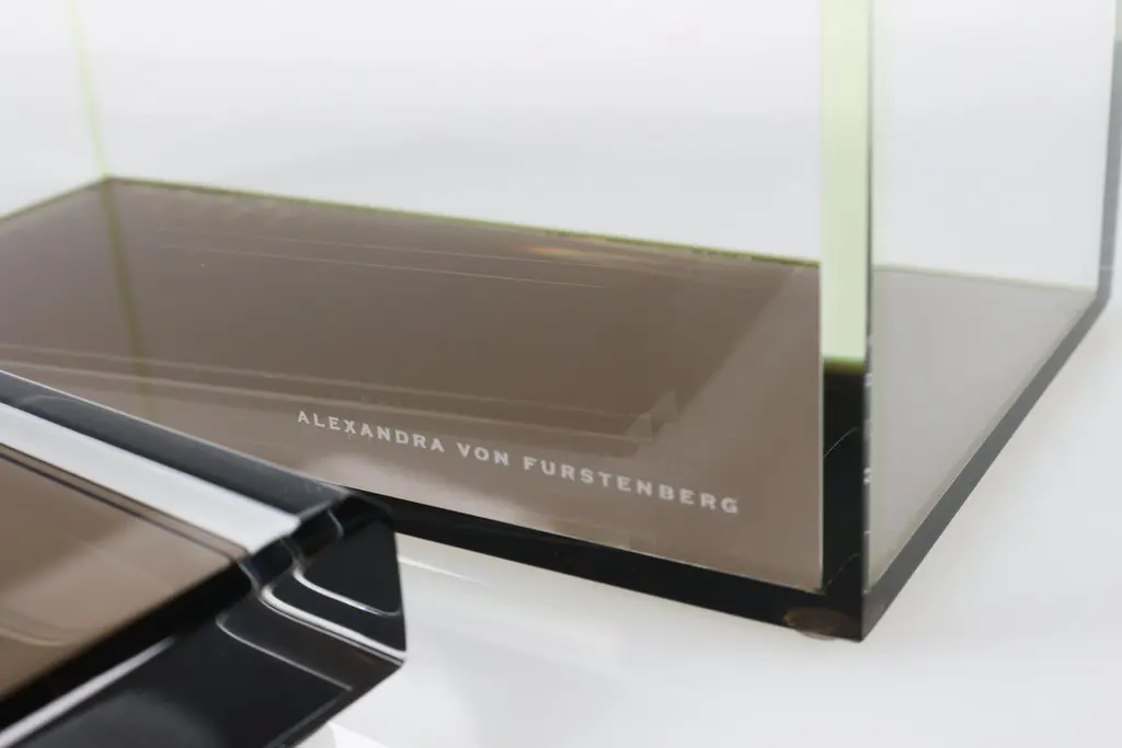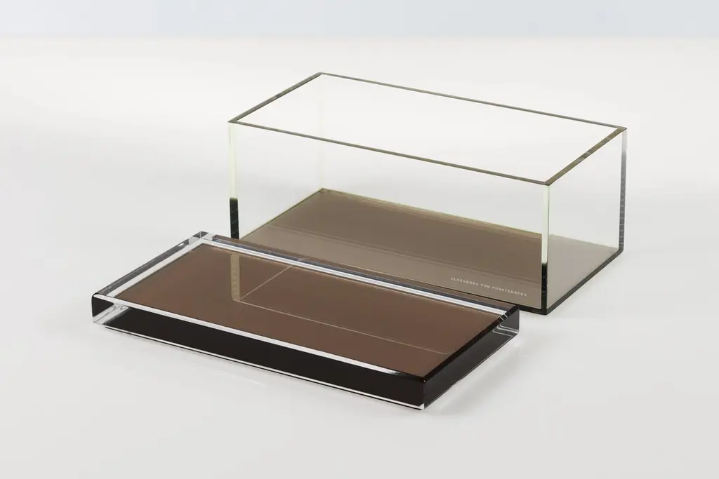 Add a bold pop of modern glamour to your space with this acrylic treasure box by Alexandra Von Furstenberg, featuring a striking Bronze. Made from high-quality Lucite, this chic decorative storage box is perfect for holding jewelry, keys, or other small treasures. Its contemporary geometric design makes it a stylish accent on a vanity, coffee table, or entry console. A statement piece for lovers of modern, minimalist, or high-gloss decor.Available in two sizes:Medium: 8" W x 4" D x 4.375" H - $390Large: 10" W x 5" D x 4.875" H - $450