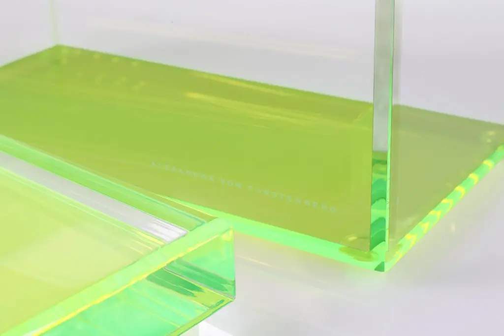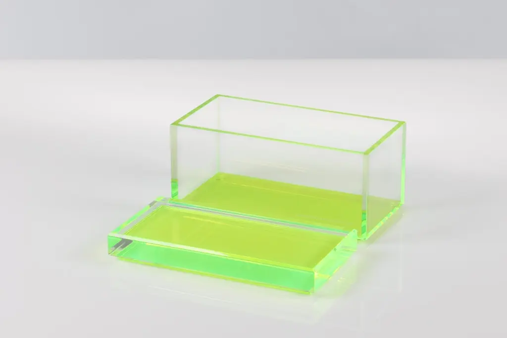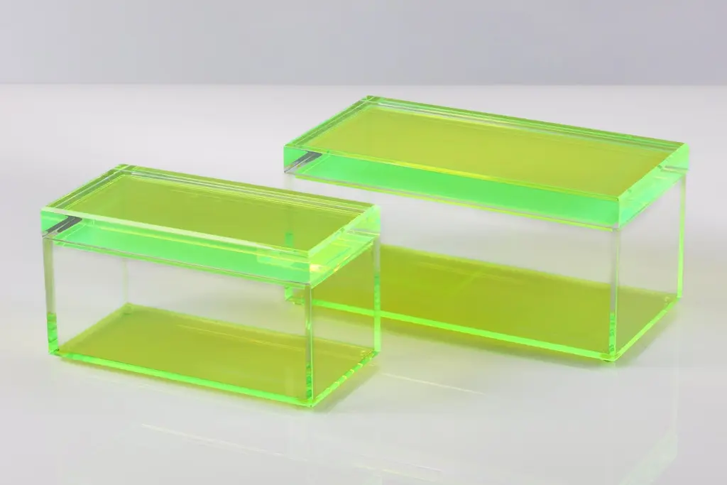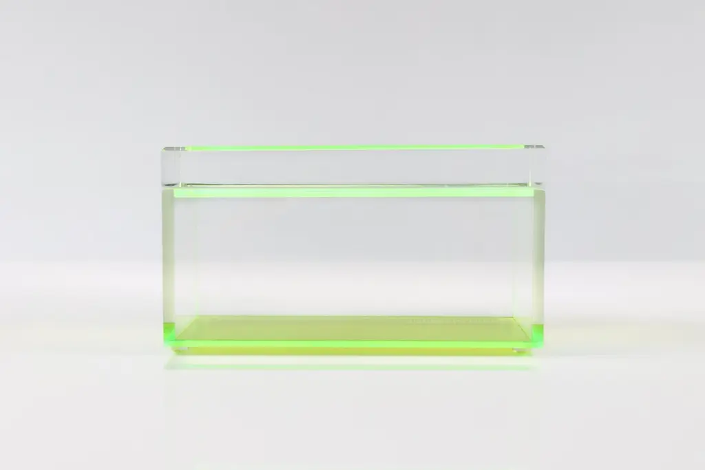 Add a bold pop of modern glamour to your space with this acrylic treasure box by Alexandra Von Furstenberg, featuring a striking neon Green. Made from high-quality Lucite, this chic decorative green and clear storage box is perfect for holding jewelry, keys, or other small treasures. Its contemporary geometric design makes it a stylish accent on a vanity, coffee table, or entry console. A statement piece for lovers of modern, minimalist, or high-gloss decor.Available in two sizes:Medium: 8" W x 4" D x 4.375" H - $390Large: 10" W x 5" D x 4.875" H - $450