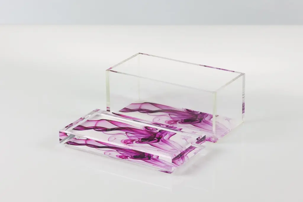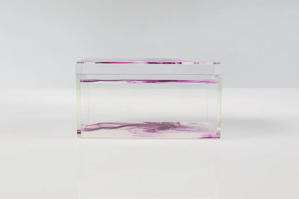 Add a bold pop of modern glamour to your space with this acrylic treasure box by Alexandra Von Furstenberg, featuring a striking purple and white Magenta Smoke. Made from high-quality Lucite, this chic decorative storage box is perfect for holding jewelry, keys, or other small treasures. Its contemporary geometric design makes it a stylish accent on a vanity, coffee table, or entry console. A statement piece for lovers of modern, minimalist, or high-gloss decor.Available in two sizes:Medium: 8" W x 4" D x 4.375" H - $455Large: 10" W x 5" D x 4.875" H - $515