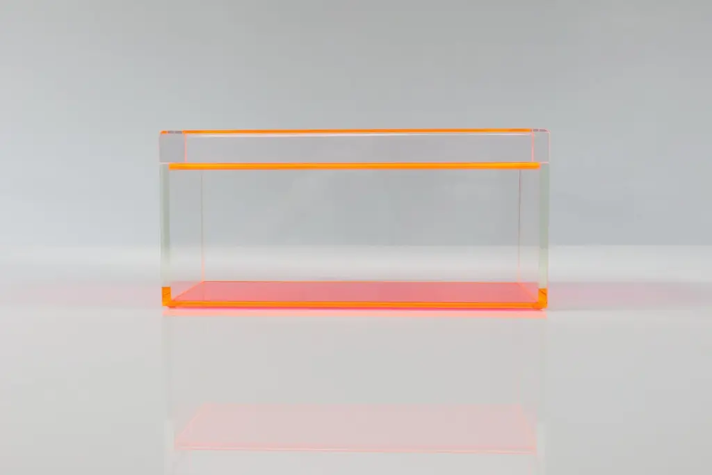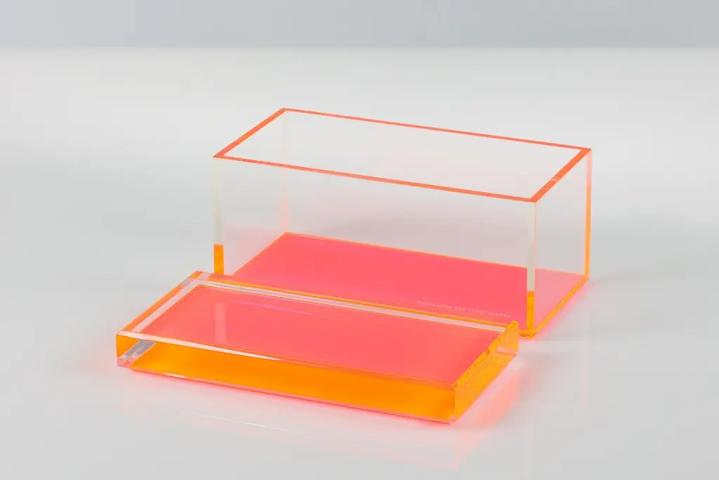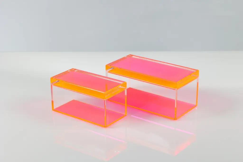 Add a bold pop of modern glamour to your space with this acrylic treasure box by Alexandra Von Furstenberg, featuring a striking hot Pink. Made from high-quality Lucite, this chic decorative storage box is perfect for holding jewelry, keys, or other small treasures. Its contemporary geometric design makes it a stylish accent on a vanity, coffee table, or entry console. A statement piece for lovers of modern, minimalist, or high-gloss decor.Available in two sizes:Medium: 8" W x 4" D x 4.375" H - $390Large: 10" W x 5" D x 4.875" H - $450