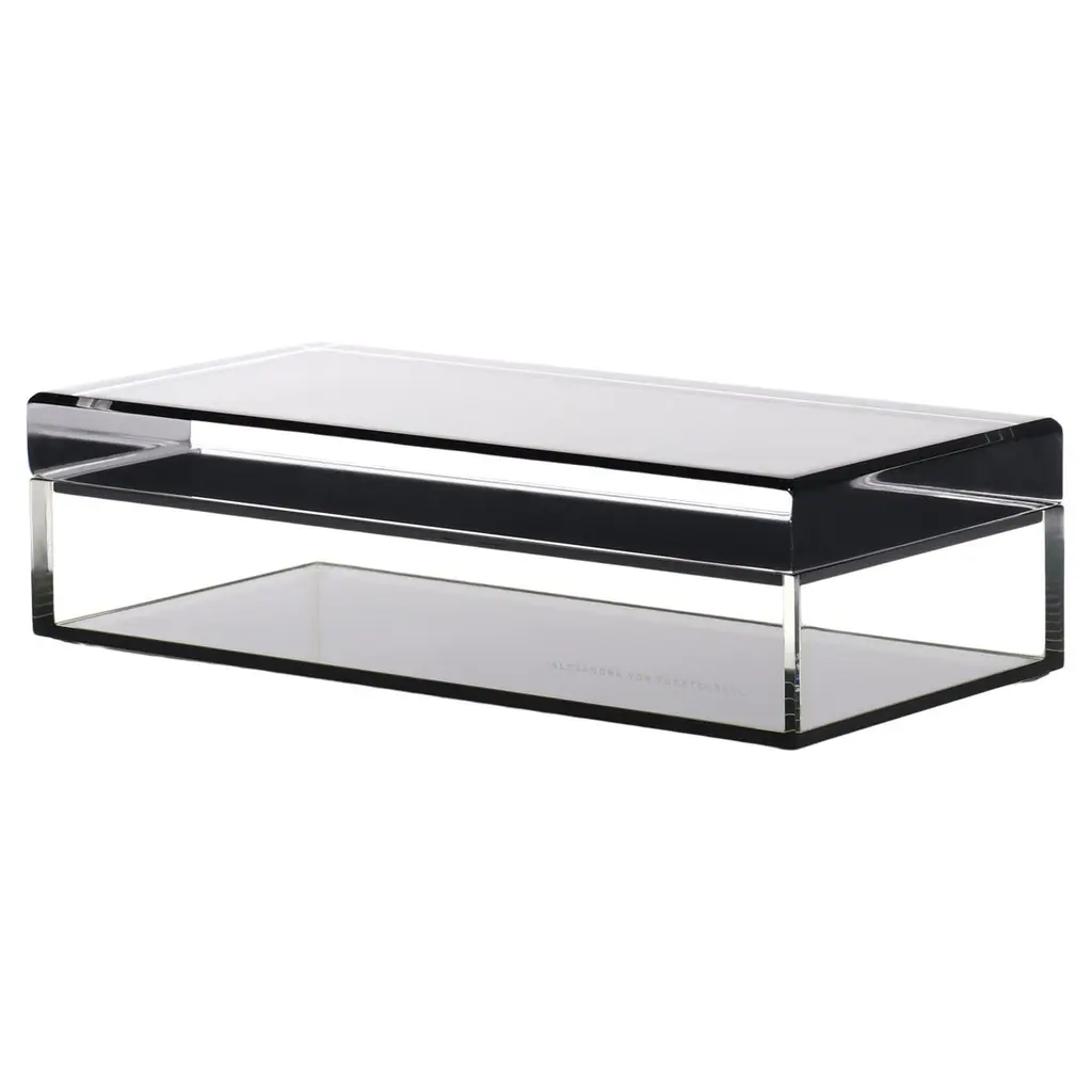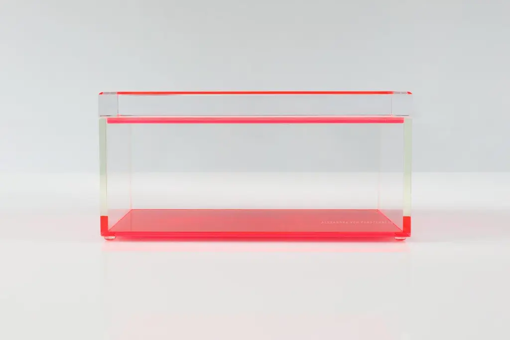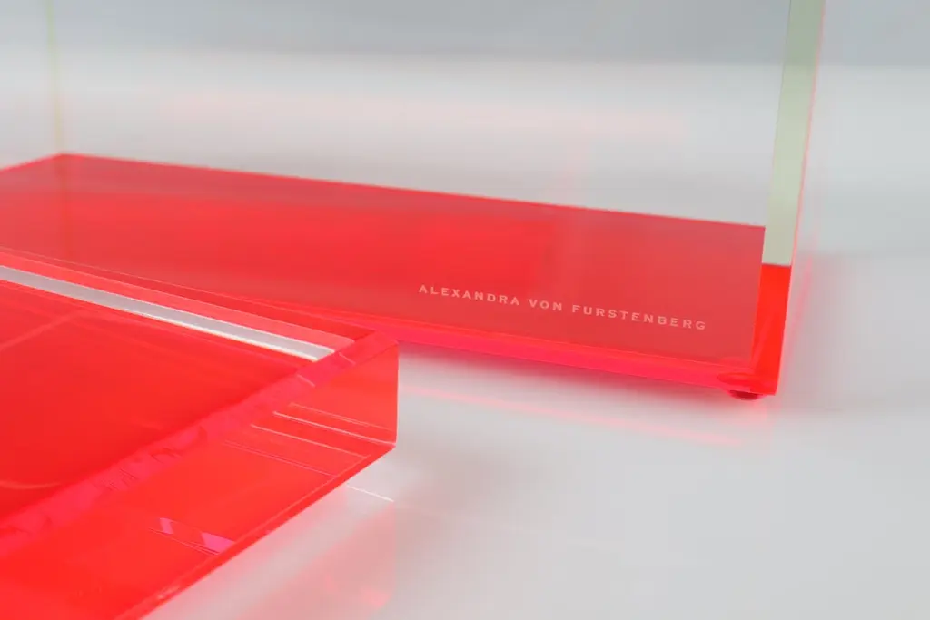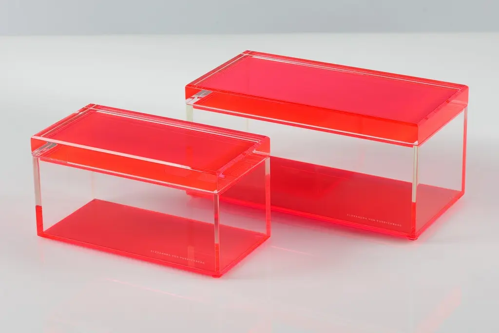 Add a bold pop of modern glamour to your space with this acrylic treasure box by Alexandra Von Furstenberg, featuring a striking Red. Made from high-quality Lucite, this chic decorative storage box is perfect for holding jewelry, keys, or other small treasures. Its contemporary geometric design makes it a stylish accent on a vanity, coffee table, or entry console. A statement piece for lovers of modern, minimalist, or high-gloss decor.Available in two sizes:Medium: 8" W x 4" D x 4.375" H - $390Large: 10" W x 5" D x 4.875" H - $450