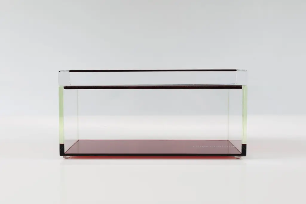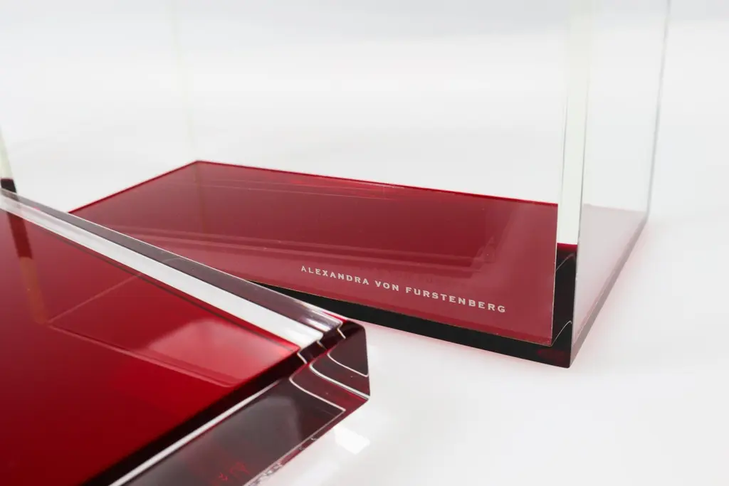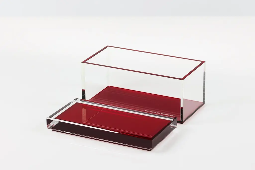 Add a bold pop of modern glamour to your space with this acrylic treasure box by Alexandra Von Furstenberg, featuring a striking Ruby. Made from high-quality Lucite, this chic decorative ruby red storage box is perfect for holding jewelry, keys, or other small treasures. Its contemporary geometric design makes it a stylish accent on a vanity, coffee table, or entry console. A statement piece for lovers of modern, minimalist, or high-gloss decor.Available in two sizes:Medium: 8" W x 4" D x 4.375" H - $390Large: 10" W x 5" D x 4.875" H - $450