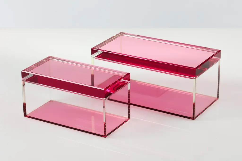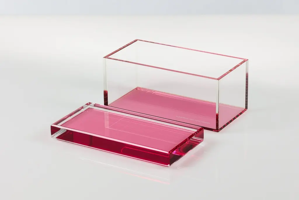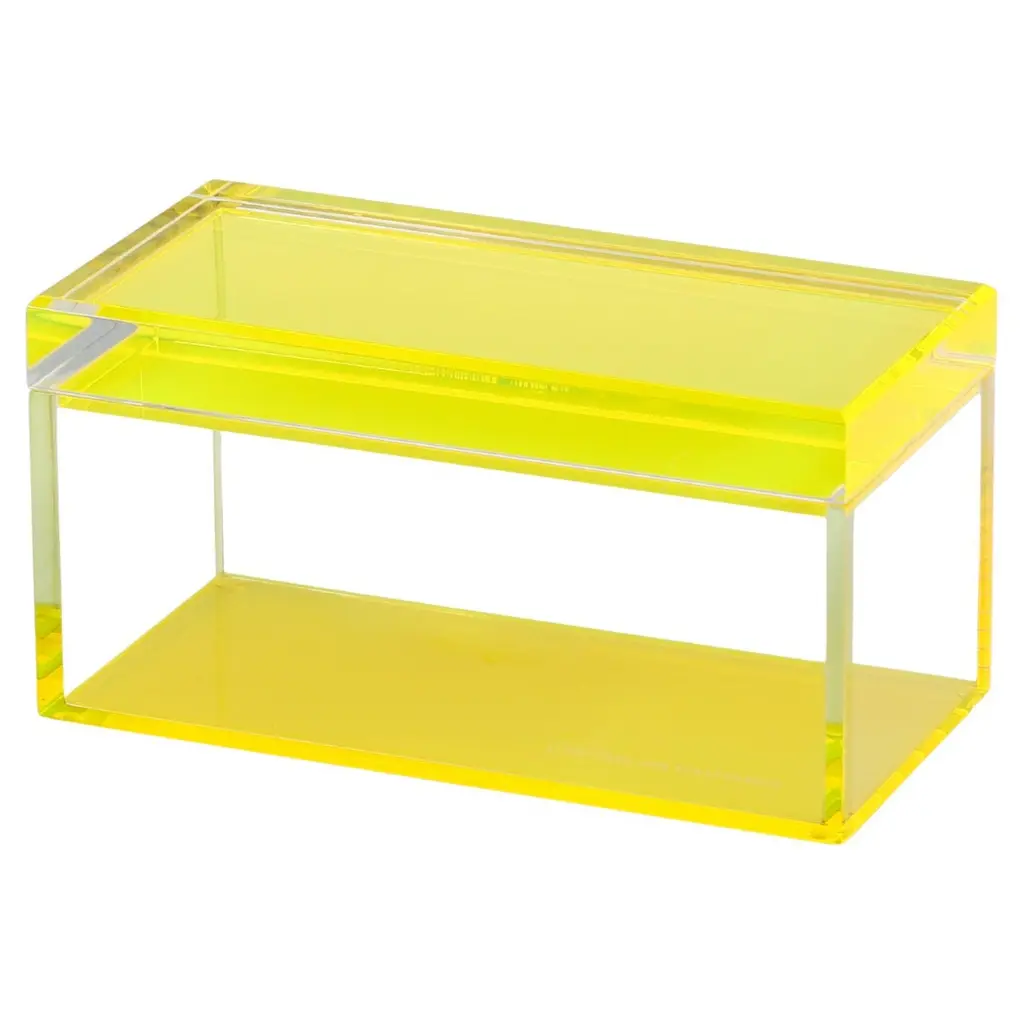 Add a bold pop of modern glamour to your space with this acrylic treasure box by Alexandra Von Furstenberg, featuring a striking Tulip. Made from high-quality Lucite, this chic decorative storage box is perfect for holding jewelry, keys, or other small treasures. Its contemporary geometric design makes it a stylish accent on a vanity, coffee table, or entry console. A statement piece for lovers of modern, minimalist, or high-gloss decor.Available in two sizes:Medium: 8" W x 4" D x 4.375" H - $390Large: 10" W x 5" D x 4.875" H - $450