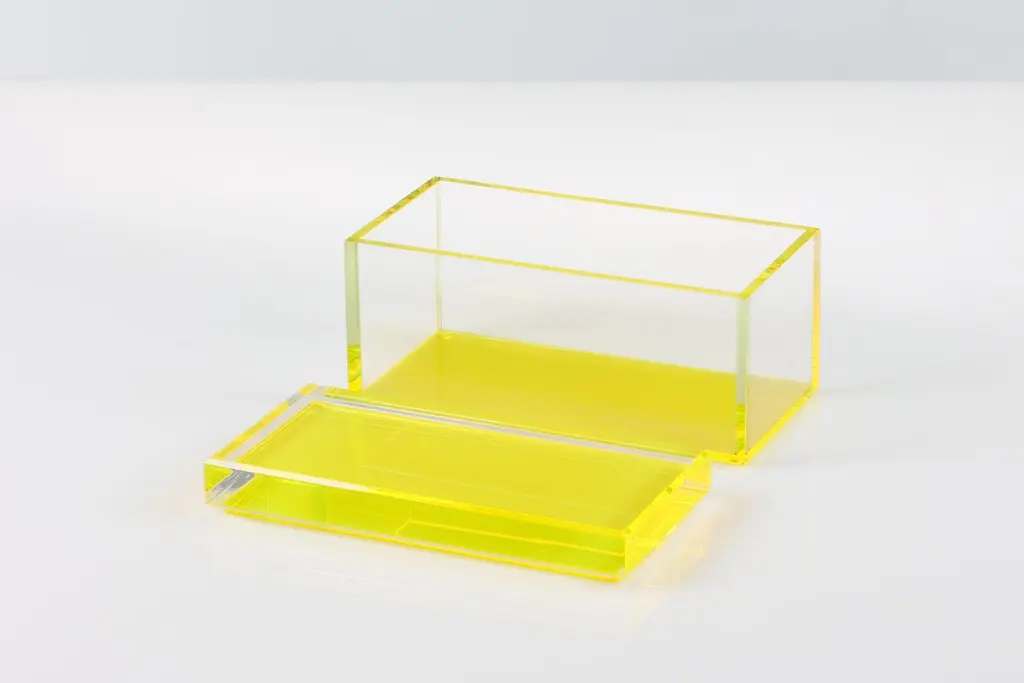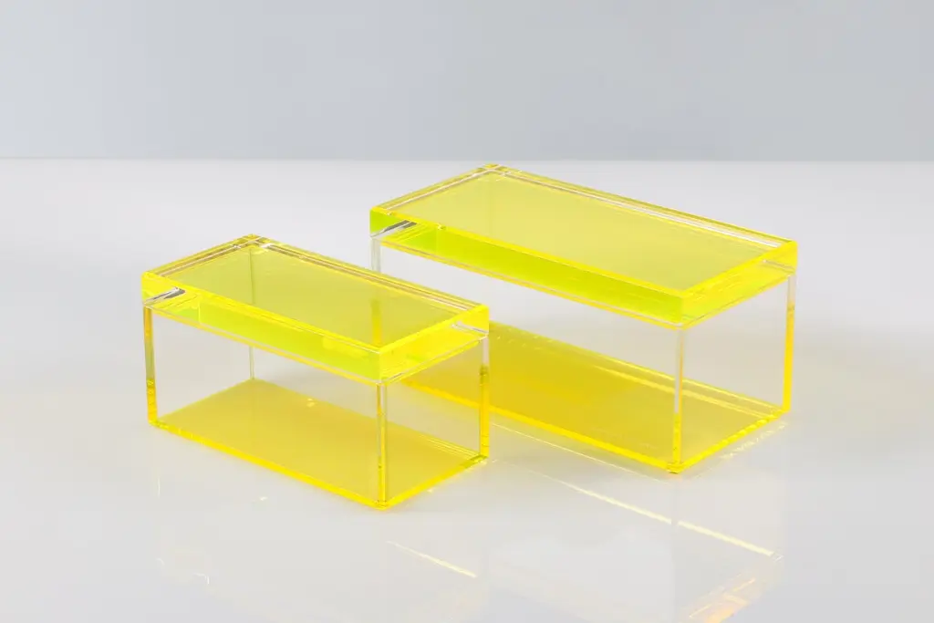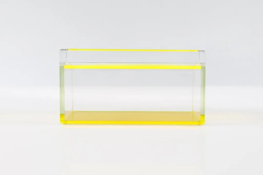 Add a bold pop of modern glamour to your space with this acrylic treasure box by Alexandra Von Furstenberg, featuring a striking bright Yellow. Made from high-quality Lucite, this chic decorative storage box is perfect for holding jewelry, keys, or other small treasures. Its contemporary geometric design makes it a stylish accent on a vanity, coffee table, or entry console. A statement piece for lovers of modern, minimalist, or high-gloss decor.Available in two sizes:Medium: 8" W x 4" D x 4.375" H - $390Large: 10" W x 5" D x 4.875" H - $450